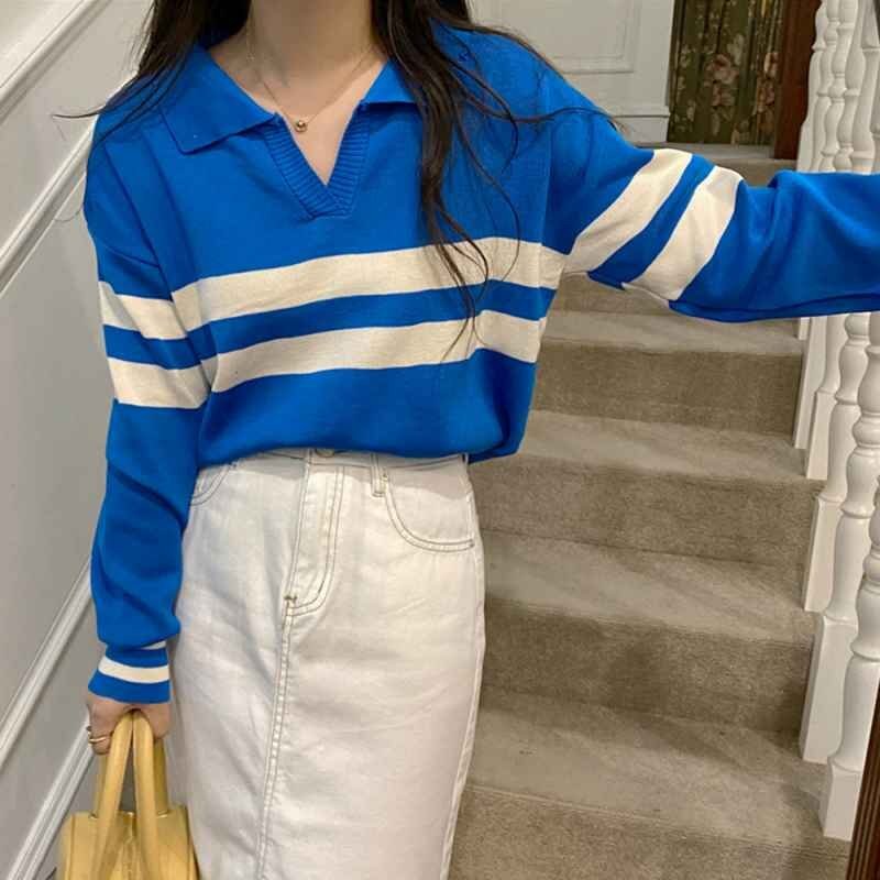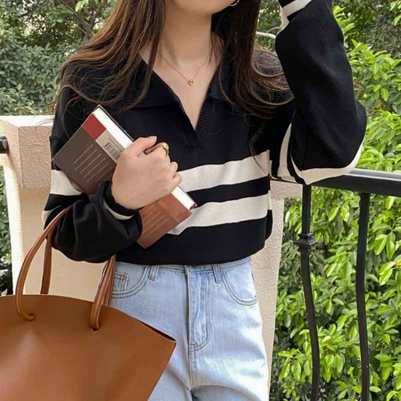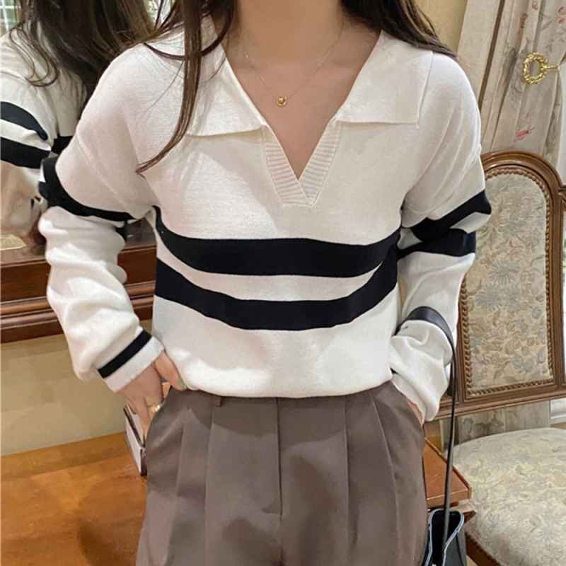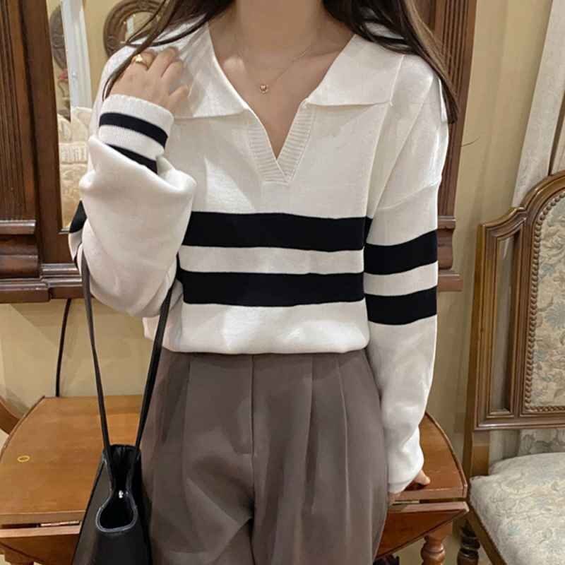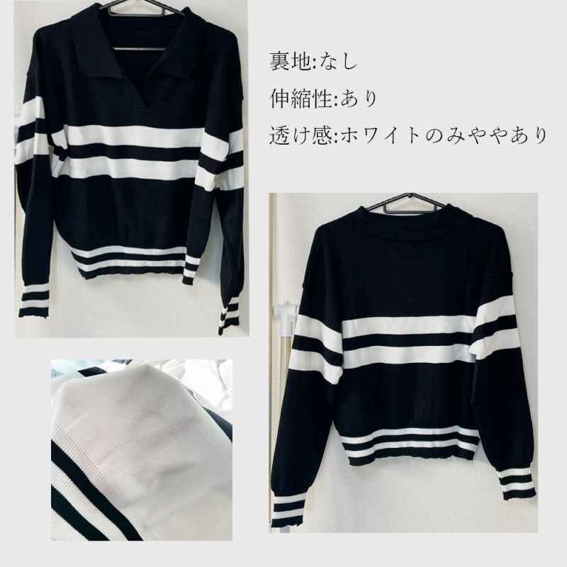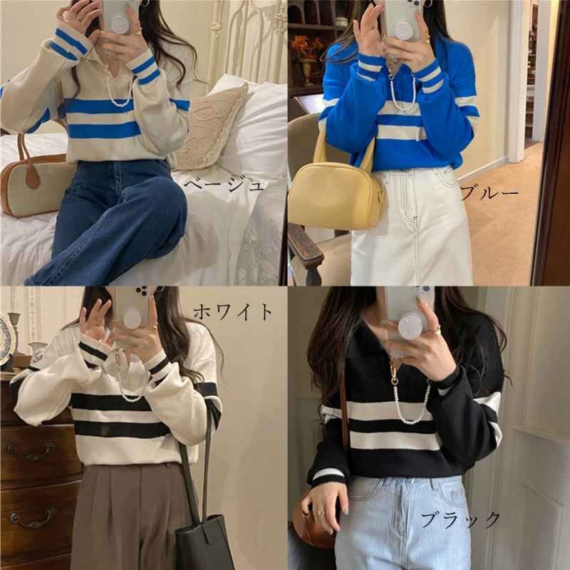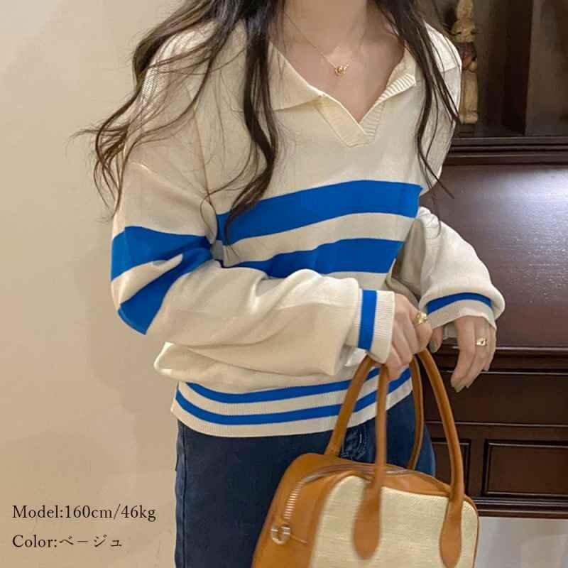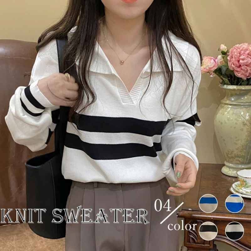 薄手ニット生地で優しい肌触りを与える、角襟のデザインもレトロなお洒落感を演出するニットトップスです。
