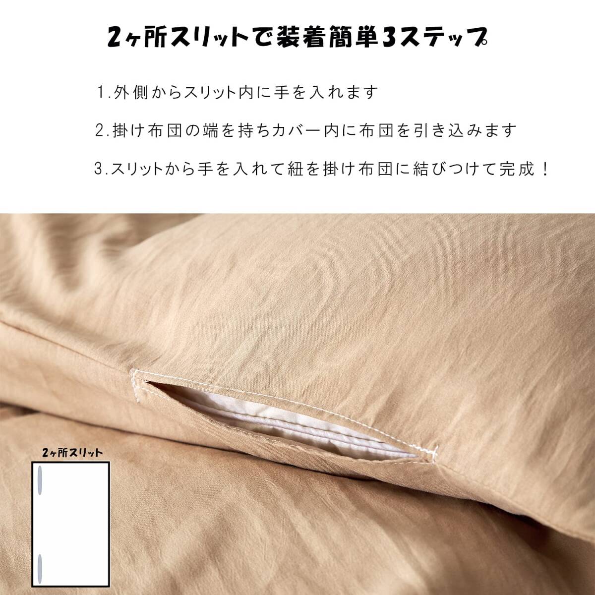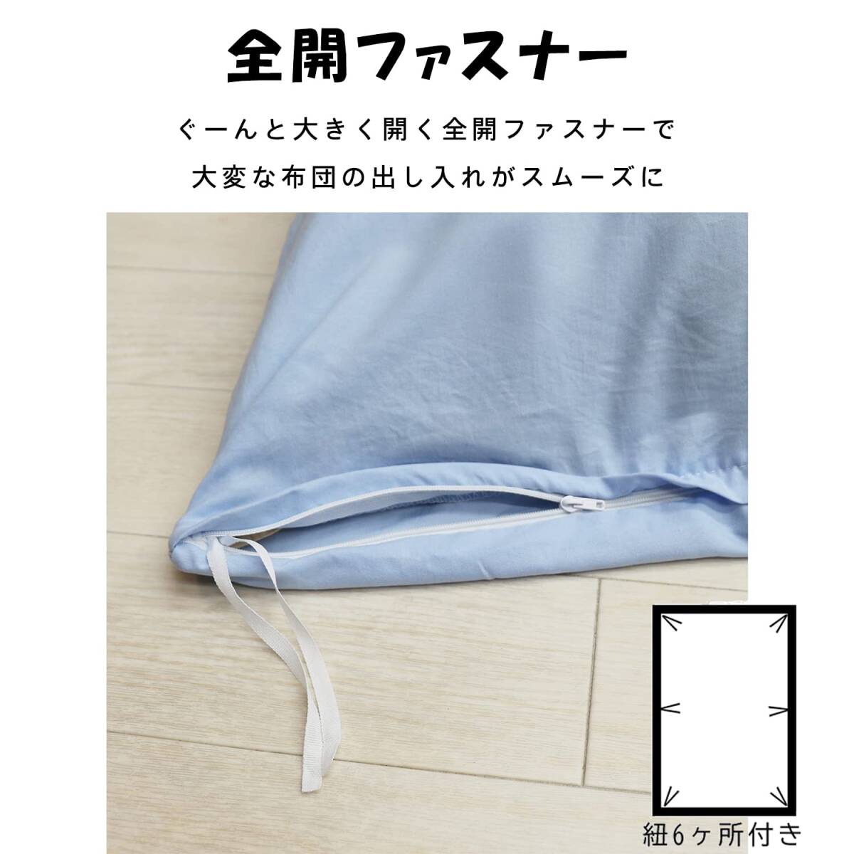 ・【使いやすさ】当商品は使いやすさにこだわりカバーの片側側面に全開ファスナーをつけました。ぐーんと大きく開くので大変なふとんの出し入れがスムーズにできます。また、スリットを2箇所いれました。スリットから手を入れて布団を持つと簡単にカバーを被せることができます。使用中にふとんがズレるストレスを軽減するために結び紐を6箇所にし、より布団がズレにくくなる工夫を致しました。