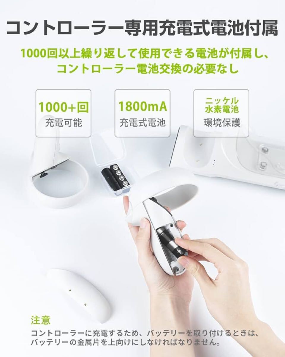 コントローラー用充電式バッテリー(1,800mAh×2)付属:環境保護のため、環境に優しい充電式ニッケル水素電池を採用しています。1,000回以上繰り返し使用でき、省エネで環境に優しいです。Quest2コントローラーのバッテリー交換が不要になり、より便利になります。