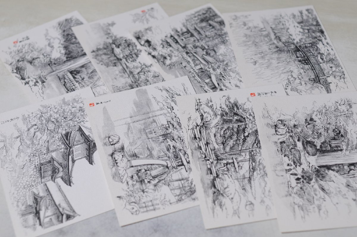 3-1973【絵葉書】 兼六園 スケッチ 8枚袋