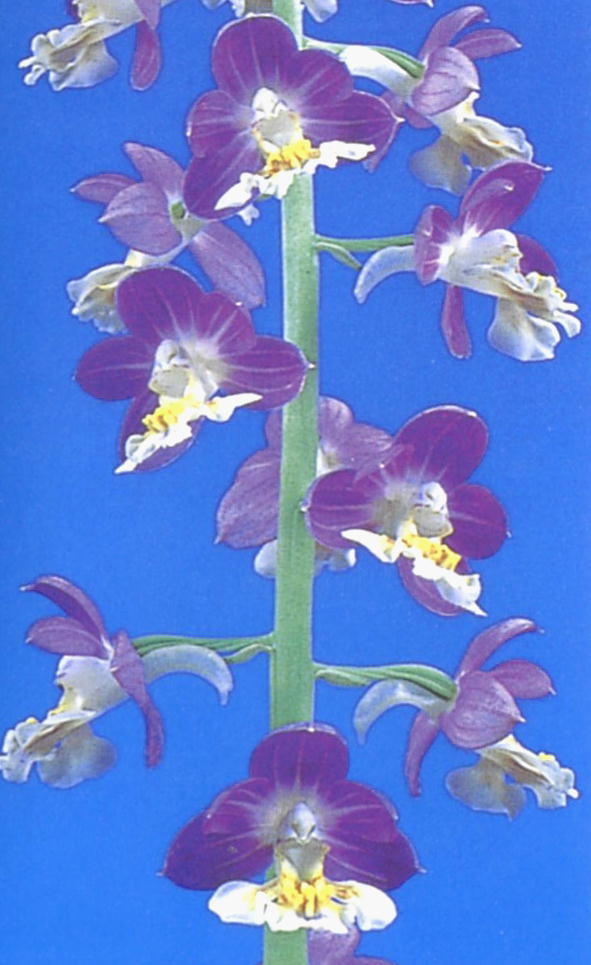 花の詳細: 花弁内に白のストライプを発する紫の花弁に白の舌  花はうつむかず真正面を向きキッチリと花間を取るバランスの良い中輪梅弁花  作り易くえびね初心者の方でも容易に栽培出来ます