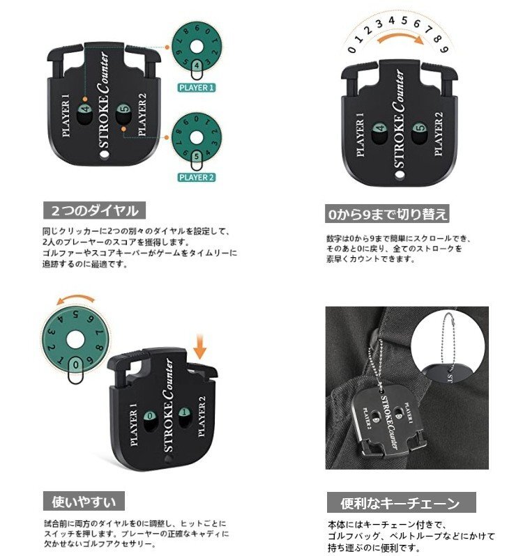 2人のプレーヤーのヒット、ショット、またはパットを同時にカウントするためのデュアルダイヤル デザイン。大会や試合でのスコア管理に便利です。