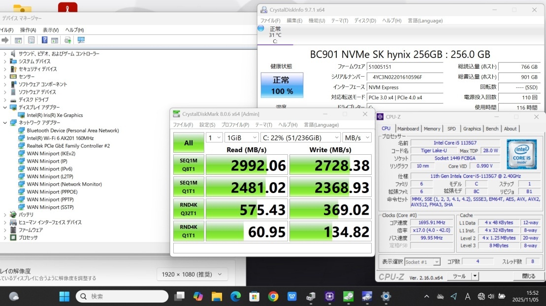 | CPU: 超高速 Intel 卓越性能 第11世代Core i5-1135g7 2.4Ghz、 4コア8スレッド (ターボ・ブースト利用時の最大周波数 4.2GHz) |