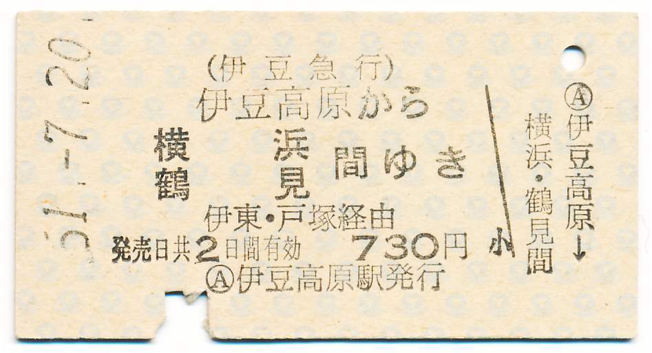 伊豆急行 伊豆高原駅発行 一般式常備片道乗車券 伊豆高原から 横浜、鶴見間ゆき 伊東・戸塚経由 てせす。