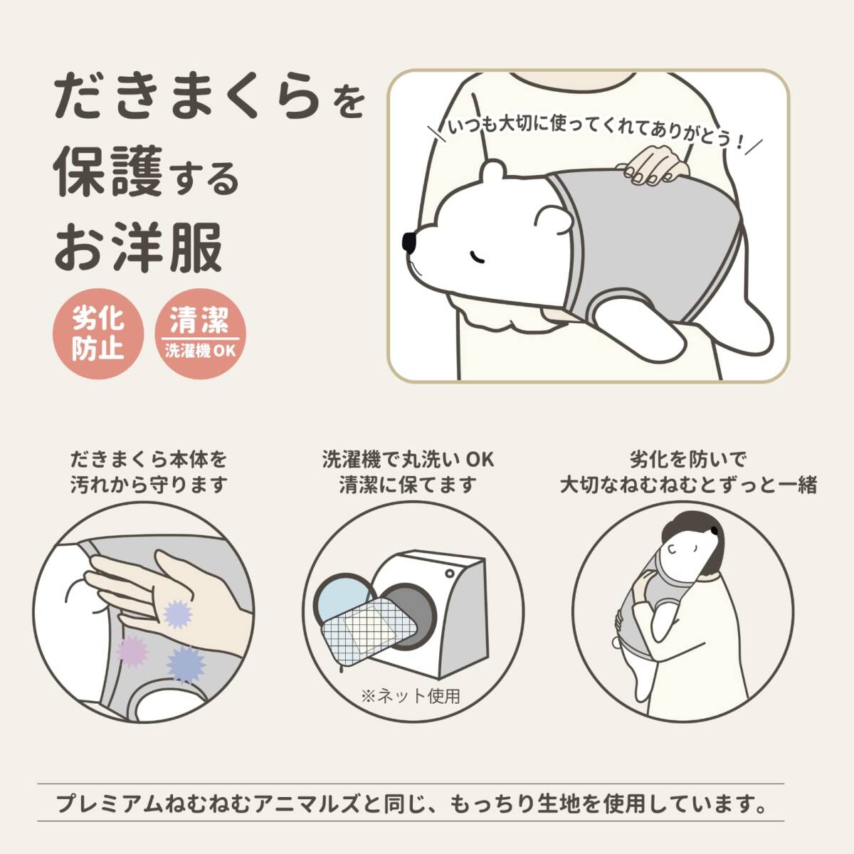 説明 【プレミアムねむねむアニマルズ専用 抱き枕カバー】 動物の抱きまくら人気NO.1の“プレミアムねむねむアニマルズ”の抱き枕専用のカバーが登場しました。 抱き枕に合わせたMサイズとLサイズ展開です。 汚れやすいからだ部分に抱き枕カバー(お洋服)を着せて、可愛く清潔にお使いいただけるアイテムです。 ネットを使用して洗濯機で丸洗いしていただけます。 ※アザラシのグー・クジラのカナロア・フラミンゴのララ以外は着用可能です。2023年SS時点