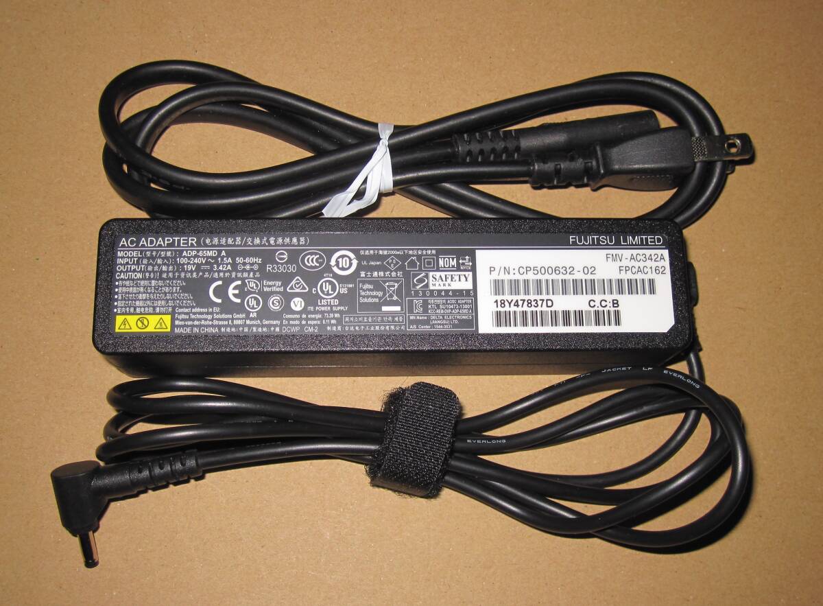 富士通のノートPC用純正ACアダプタ FMV-AC342A / FPCAC162 / ADP-65MD (入力:AC100-240V/出力:DC19V 3.42A)、プラグはAC側がメガネケーブル、DC側のプラグは外径3.5mm×内径1.35mmのセンタープラスです。スペックの詳細や対応機種は以下のURLを参照願います。https://www.fmv.com/store/pid/FMV-AC342A.html
