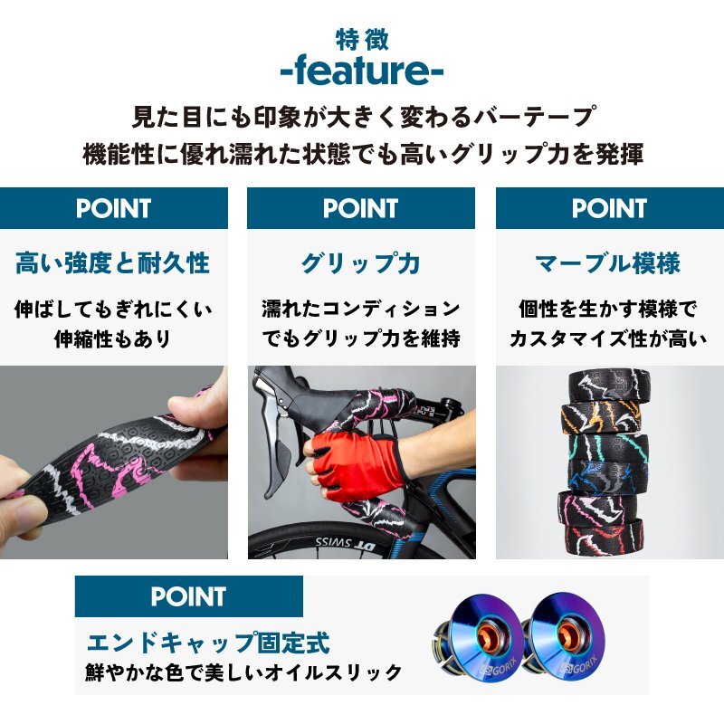 見た目にも印象が大きく変わるバーテープ。 機能性に優れ濡れた状態でも高いグリップ力を発揮! 伸縮性を残しつつ耐久性と強度を強化するためシリコンを配合。 タフで扱いやすい、また自転車のカスタマイズに適した柄デザインに仕上がっています。 [シリコン×PUレザー高い強度耐久性] 伸縮性高いPUレザーに強度は高く耐久性に優れているシリコンを配合しタフで扱いやすいテープに。 シリコンを配合する事で付着した汚れを落としやすい。そして伸ばしてもちぎれにくい(巻きやすい) [グリップ力] 雨や汗に濡れても優れたグリップ力を発揮し高いコントロール性を実現。 バーテープ表面には滑り止め加工が施してありグリップ力がさらに向上。 [感触] 感触の良い握り心地と程よい薄さで手に吸い付くような触り心地は長時間のライドも快適に。 厚み2.2mmでテープ表面はベタベタしない。 [衝撃吸収] 悪路やオフロードでの地面から受ける振動を抑える。 グラベルなどの未舗装路走行の自転車にも最適。 [柄デザイン] 個性を生かすマーブル模様でデザイン性高い柄。 見た目にも印象が大きく変わるバーテープで自転車カスタムも楽しめます。 [カラー豊富] ホワイトやレッド、ブルーの定番カラーから根強いカラーのチェレステやピンク、オレンジカラーも取り揃えています。 [固定式エンドキャップ] 紛失しにくく使い易いタイプのエンドキャップを採用。 綺麗でおしゃれなオイルスリックカラー。 先端技術のCNC加工法で作成し、頑丈で耐久性に優れています。 商品内容バーテープ、エンドキャップ、エンドテープ サイズ厚み2.2mm×長さ2150mm 材質表面PUレザー+シリコン、裏面EVA | |