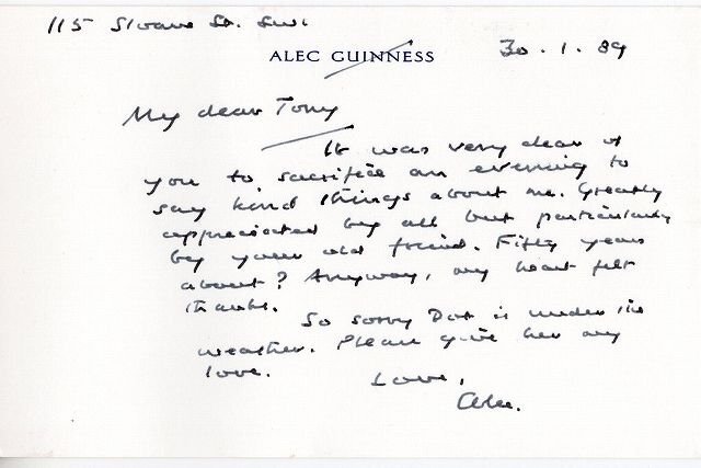 レターは同氏のレターヘッド入り小型便せんに1989年1月30日付で書かれており、晩餐会において自らへの賛辞をこめたスピーチを述べたことに対する謝意が書かれています。 末尾には”Alec “と簡略化された署名が残されています。