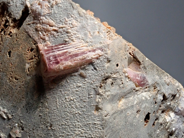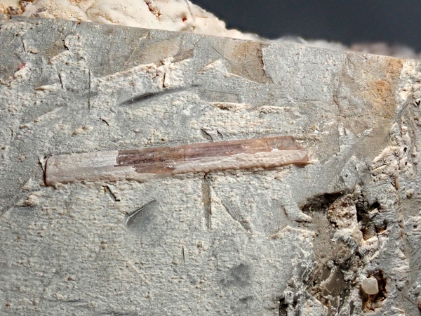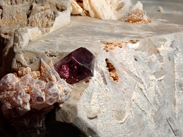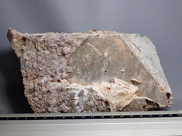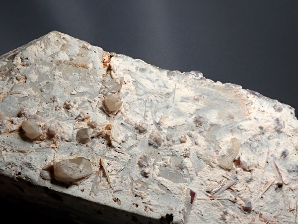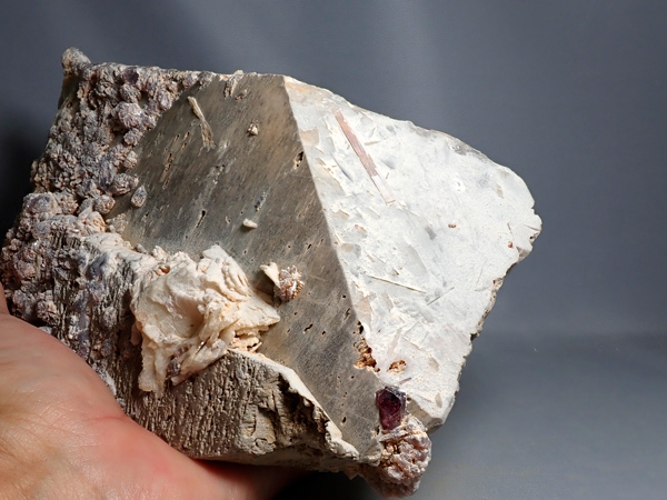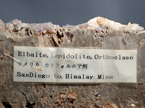 大きな長石の結晶が欲しくてホリミネから購入したものです。目当てだった正長石にはリチア電気石、リチア雲母、トパズをともなっており、長らく展示していたものです。重さ2㎏越えの大型標本で展示向きです。