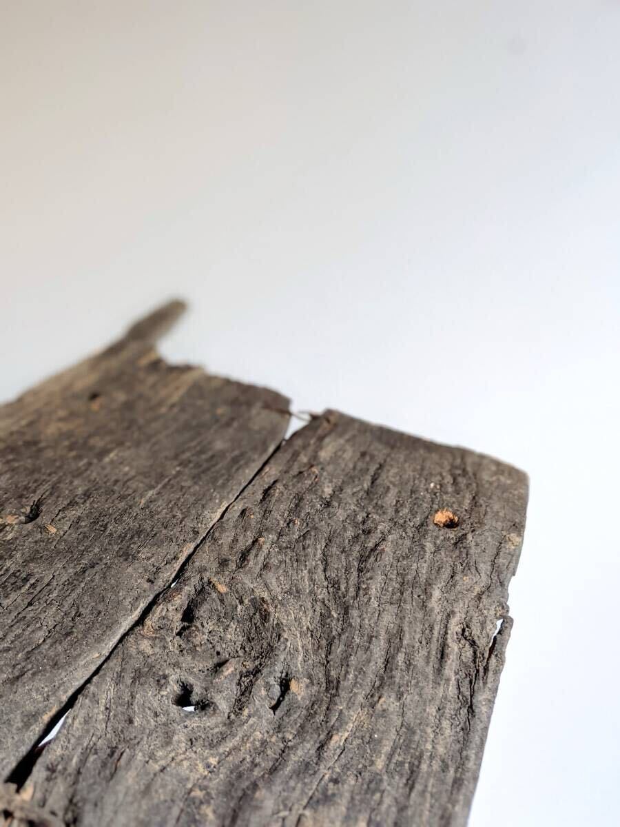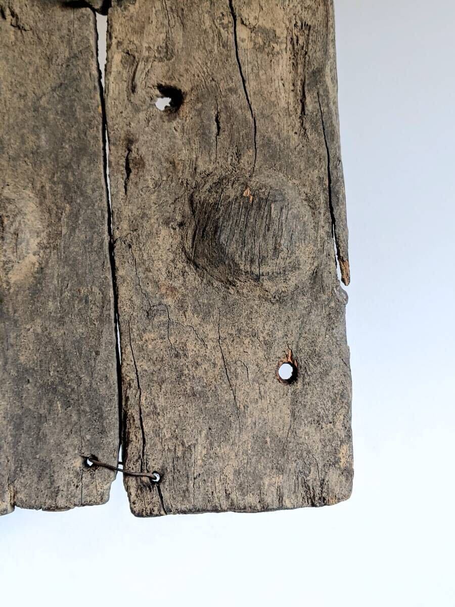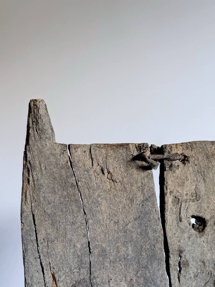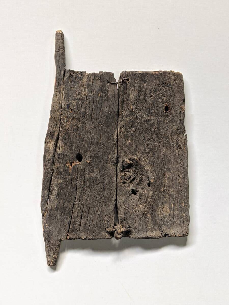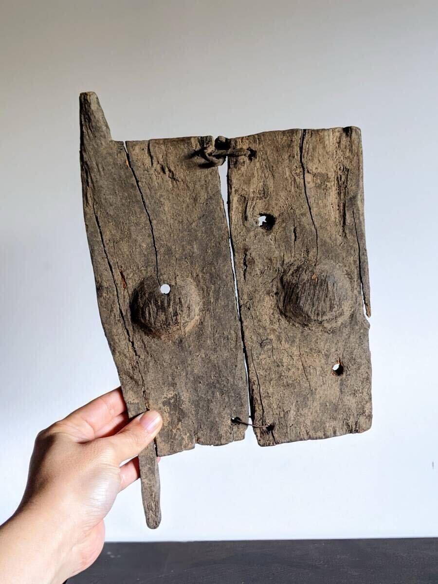 2枚の板を繋げる金具の上のものは針金のようなもので補修されております。(手に入れた時からのもの)