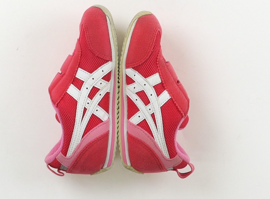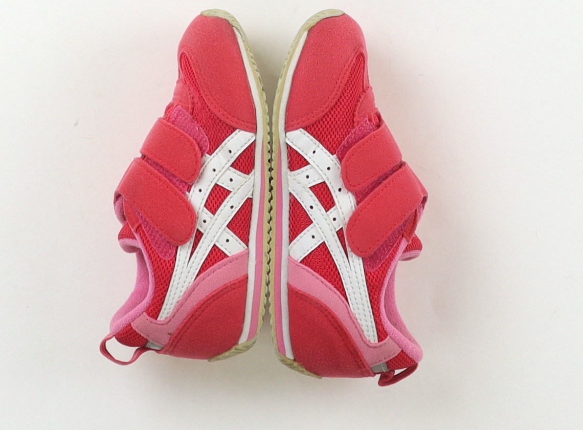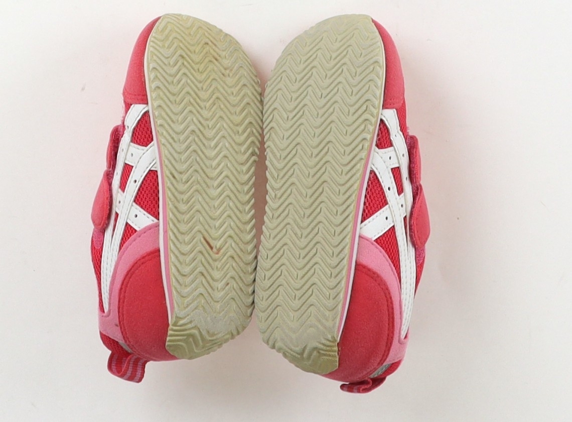 実際のサイズ表記は15cm。マジックテープでの着脱。ベロの記名欄に記名跡があります。かかとに底擦れがあります。全体的に使用感がありますが、特に目立つ汚れはなくまだお使い頂けそうです。