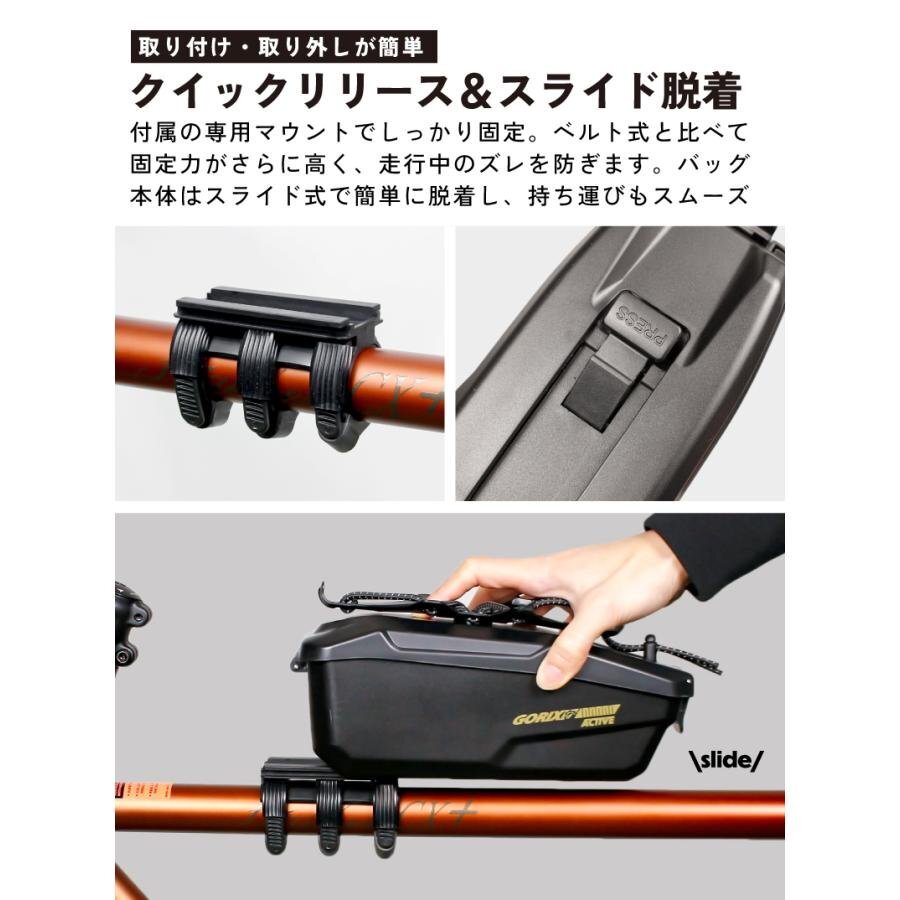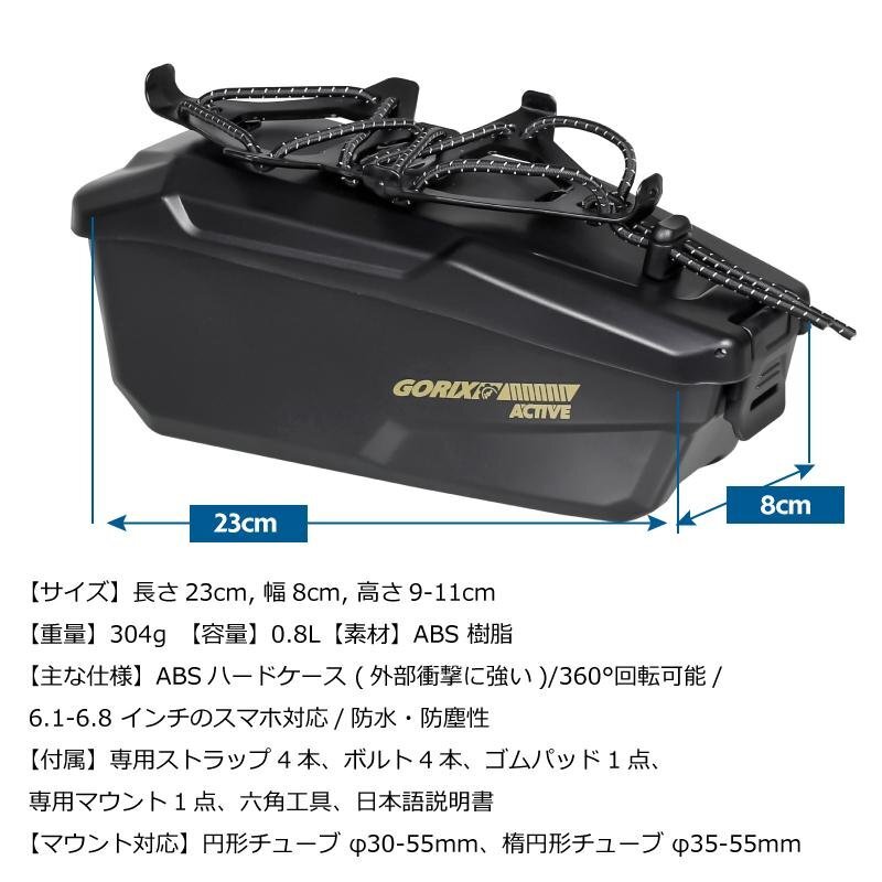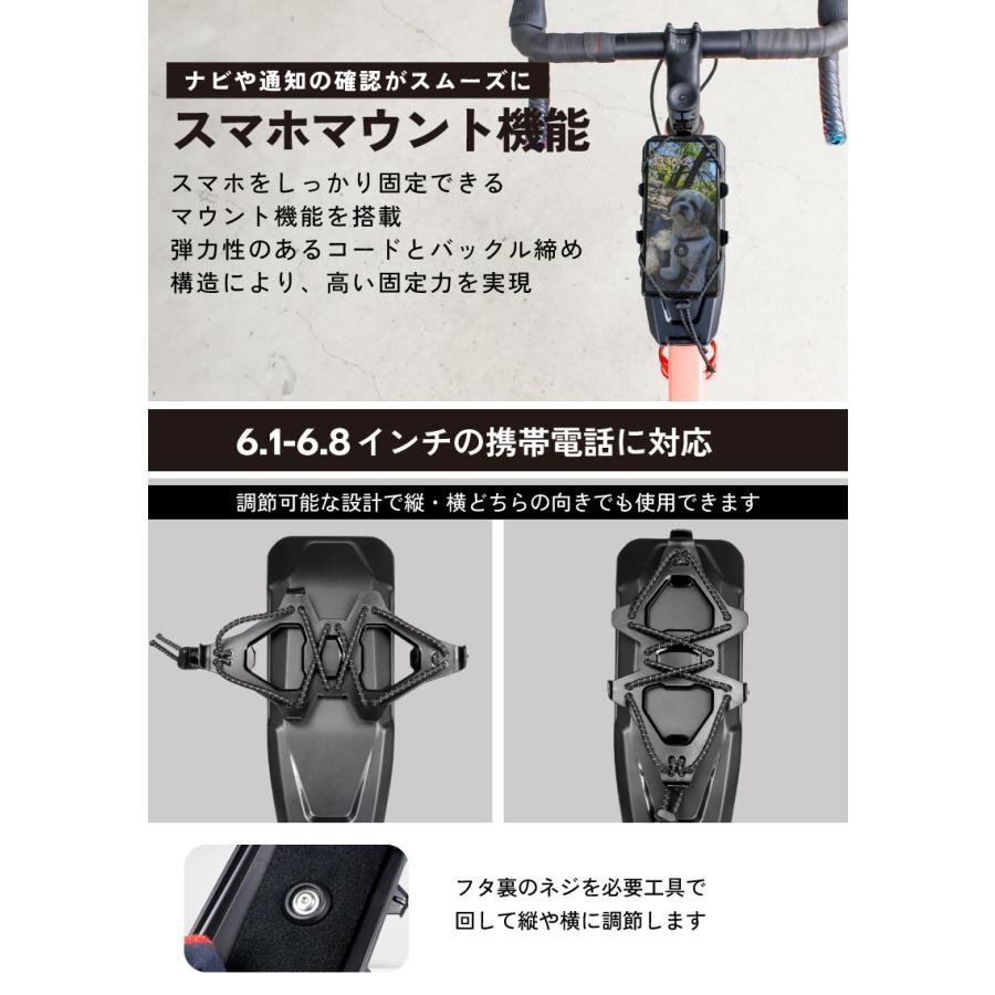 GORIX 自転車トップチューブバッグ active T6 「実用性と耐久性を兼ね備えたトップチューブバッグ」 長距離ライドや通勤・通学、ツーリングなど、さまざまなシーンで活躍するトップチューブバッグ。 本体には工業用耐衝撃性のABS樹脂を採用し、外部からの衝撃に強く、バッグの形状をしっかり保ちます。 さらに高い防水性を備え、突然の雨や泥はねから大切な荷物を守ります※。 スマホマウント機能を搭載し、6.1-6.8インチのスマートフォンに対応。縦横どちらの向きでも使え、ナビを見ながらの走行や、停車中の通知チェックもスムーズ。 弾力性のあるコードとバックル締め構造により、荒れた路面でもしっかり固定できます。 容量0.8Lで、財布や工具、補給食などを収納可能。大きく開くデザインで中身が見やすく、カチッと締める構造で荷物の落下を防ぎます。 専用ブラケットは工具で固定するタイプでズレにくく、バッグ本体はスライド式で簡単に取り外せるので、駐輪時の持ち運びにも便利です。 耐摩耗性・防水性に優れた軽量素材を採用し、日常使いから本格的なロングライドまで対応。 長時間のライドでも快適に使える、実用性と耐久性を兼ね備えたトップチューブバッグです。 ※防水性はありますが、長時間の大雨にはご注意ください。 特徴 ●スマホマウント機能付き ●6.1-6.8インチの携帯電話に対応 ●調節可能で縦・横どちらの向きでも使用可能 ●ハードシェル構造で外部衝撃に強い ●高い耐久性と防護性 ●防水性にも優れている ●荷物を安全に収納 ●容量0.8L ●大きく開くデザイン ●高い固定力の専用ブラケット ●工具でしっかり締め付けるタイプ ●軽量で耐久性に優れた素材 【スマホマウント機能】 トップチューブバッグにはスマホをしっかり固定できるマウント機能を搭載。 6.1-6.8インチの携帯電話に対応し、調節可能な設計で縦・横どちらの向きでも使用できます。 弾力性のあるコードとバックル締め構造により、高い固定力を実現。 走行中の振動にも強く、安全にスマホを保持します。ナビや通知の確認がスムーズにでき、快適なライドをサポートします。 【バッグの素材】 本体には工業用耐衝撃性のABS樹脂を採用し、高い耐久性と防護性を実現。 ハードシェル構造により外部衝撃に強く、美しいバッグの形をしっかり保ちます。 さらに、防水性にも優れており、雨天時や泥はねから内容物をしっかり守ります。 頑丈で信頼性の高い設計により、大切な荷物を安全に収納できるトップチューブバッグです。 【優れた収納力】 0.8Lの容量で、財布、工具、スマホ、補給食などの小物をすっきり収納可能。 大きく開くデザインで中身が見やすく、必要なものを素早く取り出せます。 さらに、カチッと締めるタイプの開閉構造を採用し、走行中もしっかり固定されるため安心。 コンパクトながら実用性の高い収納スペースを実現。 【高い固定力の専用ブラケット】 付属の専用マウントでしっかり固定し、最大Φ55mmまでのトップチューブに対応。 ベルト式と比べて固定力がさらに高く、走行中のズレを防ぎます。工具でしっかり締め付けるタイプのため安定性が抜群。 バッグ本体はスライド式で簡単に脱着できるため、駐輪時の持ち運びもスムーズ。 確実な固定と使いやすさを両立した設計です。 【軽量で耐久性に優れた素材】 バッグ本体には耐摩耗性と高防水性を兼ね備えた丈夫な素材を採用。 軽量ながら衝撃や摩擦に強く、長く安心して使用できます。 防水仕様のため、急な雨や泥はねから収納物をしっかり保護。 ライド中のさまざまな環境に対応できるタフな設計です。 ※完全防水ではございませんので、長時間の大雨にはご注意ください。 【商品内容】トップチューブバッグ 【サイズ】長さ23cm, 幅8cm, 高さ9-11cm 【重量】304g 【容量】0.8L 【素材】ABS 樹脂 【主な仕様】ABSハードケース (外部衝撃に強い)/360°回転可能/6.1-6.8 インチのスマホ対応/防水・防塵性 【付属】専用ストラップ4本、ボルト4本、ゴムパッド1点、専用マウント1点、六角工具、日本語説明書 【マウント対応】円形チューブ φ30-55mm、楕円形チューブ φ35-55mm 【適用】ロードバイク、MTB、クロスバイク、スポーツ電動自転車など幅広く適用 商品は入荷によりキズがある場合があります。 傷や細かい汚れが気になる方や神経質な方は入札をお控え下さい。 入荷時期により予告無く一部仕様変更する場合が有ります。 カラーはディスプレイ種類環境等により実物と異なって見える場合がございます。 |