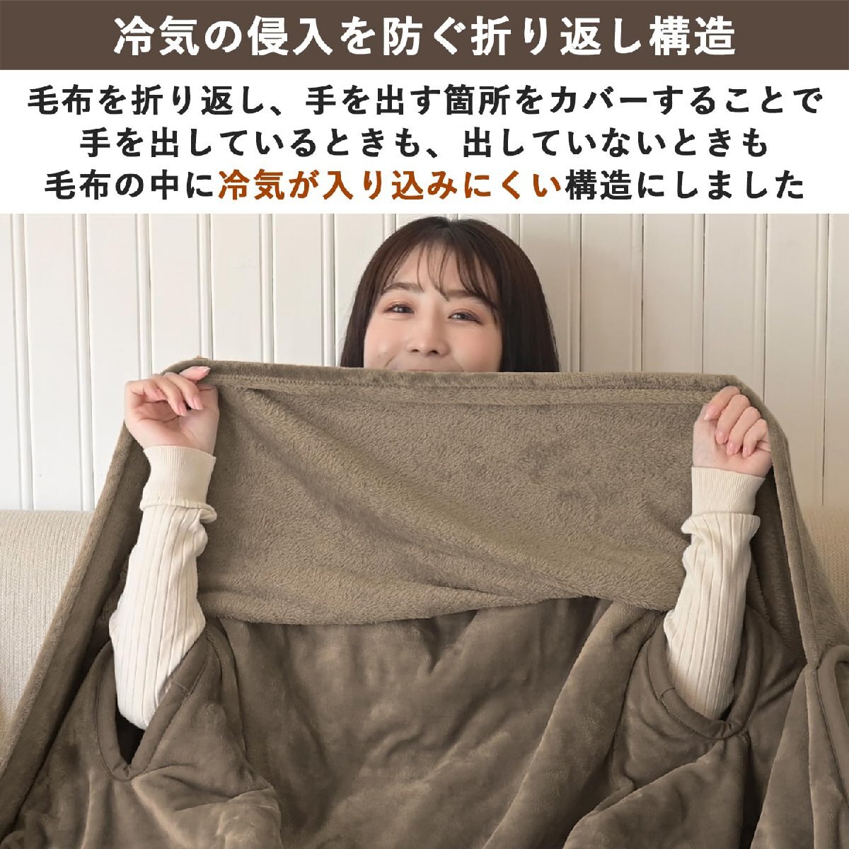 【冷気の侵入を防ぐ折り返し構造】毛布表面を折り返し構造にしたことで、アームホールから冷気が入りにくくなっており、毛布の中はしっかりとあたたまります。