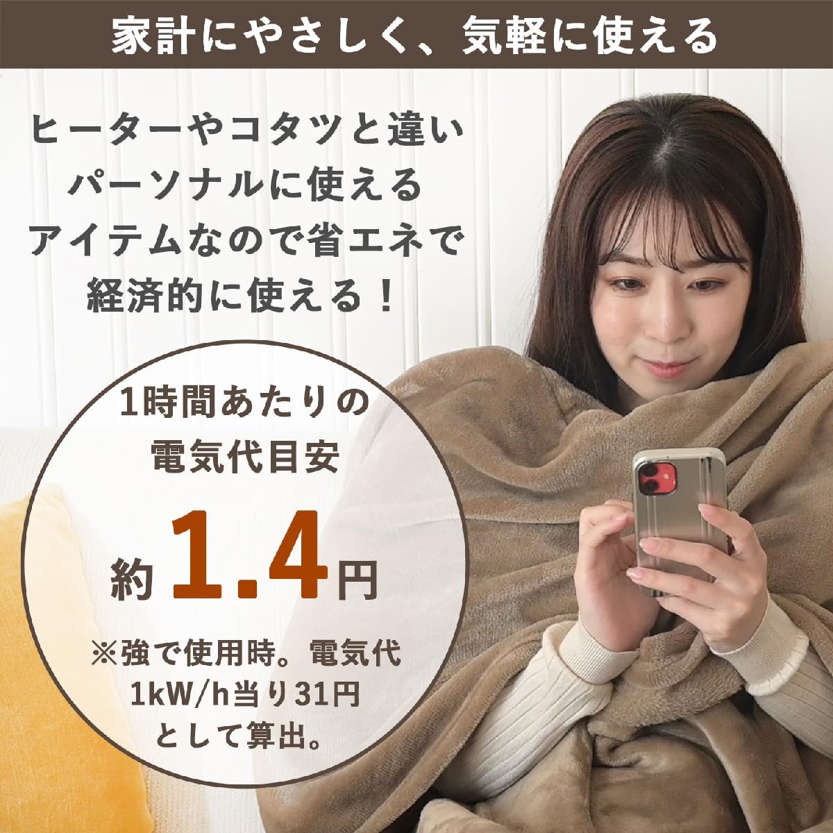 【商品仕様】本体サイズ:188×130cm、電源:交流100V(50/60Hz)、消費電力:60W、電源コードの長さ:電源側=1.96m/本体側=1.7m、消費電力量:強=約46Wh/適温=約24Wh/弱=約13Wh、1時間あたりの電気代:強=約1.4円/適温=約0.7円/弱=約0.4円(1kW/h当り31円として計算)、表面温度:強=約53度/適温=約33度/弱=約23度、保証期間:お買い上げ日より1年間(保証の範囲については、保証書をご確認ください。(一般家庭用以外(業務用など)に使用された場合の故障及び損傷などは保証対象外となります))