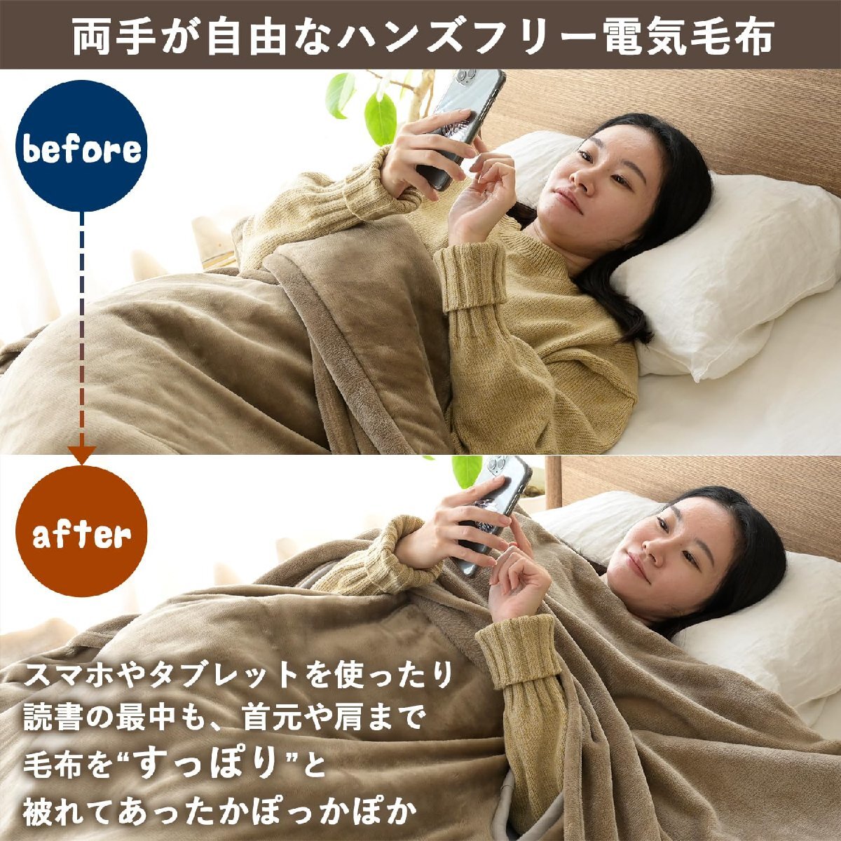 ブランド:山善(YAMAZEN)カラー:ブラウンサイズ:ダブル●寒い冬場の就寝時に便利な電気毛布。●毛布にすっぽり入ったまま両手が自由に使えるハンズフリータイプ。●毛布裏面から手を出せるアームホールがついているので、首元や方を冷やすことなくスマホやゲーム、読書が楽しめる。●アームホールから冷気が入りにくい折り返し構造で毛布の中はあったか。●肌あたりの良いヘムなし仕様(袋縫い)。●お好みに合わせて弱から強まで無段階で調節可能。●アレルギーやぜんそくの原因にもなるダニを高温でしっかり退治するダニ対策機能付き。●朝方の冷え込みをキャッチし、自動的に設定より少し高めの温度に調節する室温センサー搭載。●毛布本体は丸洗い可能でいつでも清潔に使える(コントローラーは不可)。●保証期間:お買い上げ日より1年。(保証の範囲については、取扱説明書をご確認ください。(一般家庭用以外(業務用など)に使用された場合の故障及び損傷などは保証対象外となります))。◆商品ページに掲載の取扱説明書について◆取扱説明書の内容は、製品の仕様変更等で予告なく変更される場合があります。そのため、本サービスで提供している取扱説明書の内容は、製品本体に同梱されている取扱説明書の内容と異なる場合があります。安全上のご注意は、取扱説明書が制作された時点での法的基準や業界基準に応じた内容になっています。ダウンロードされる取扱説明書(PDF)内に「保証書」が付属されている場合がございますが、正式な保証書としてはご使用になれません。取扱説明書の著作権は、株式会社山善に帰属しており、許可無く取扱説明書の内容の全部、または一部を複製したり、改ざんすることはできません。お客様は、製品の使用のためにプリントアウト(印刷)することができます。【首元・肩を冷やさずに両手が自由に使える】毛布にすっぽり入ったまま両手が自由に使えるハンズフリー電気毛布。毛布裏面から手を出せるアームホールがついているので、首元や方を冷やすことなくスマホやゲーム、読書が楽しめます。
