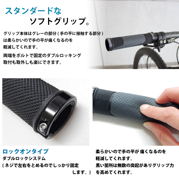 | マウンテンバイクやクロスバイクなど、フラットハンドルの自転車に最適なグリップです。 グリップ本体はグレーの部分(手の平に接触する部分)は柔らかいので手の平が 痛くなるのを軽減してくれます。 両端をボルトで固定のダブルロッキング 取り付け取り外しも簡単です。 内容 本体サイズ サイズ約:130mm 重量:約100g(ペア) 付属:エンドキャップ 内径22.2mm 3層構造 グレーは工具付属していません。 ・ディスプレイ環境により実物と色が異なる場合が有ります。 ・入荷時期により予告無く一部仕様変更する場合が有ります。 ・表記サイズは商品の伸びの無い寸法計測数値です。 | |