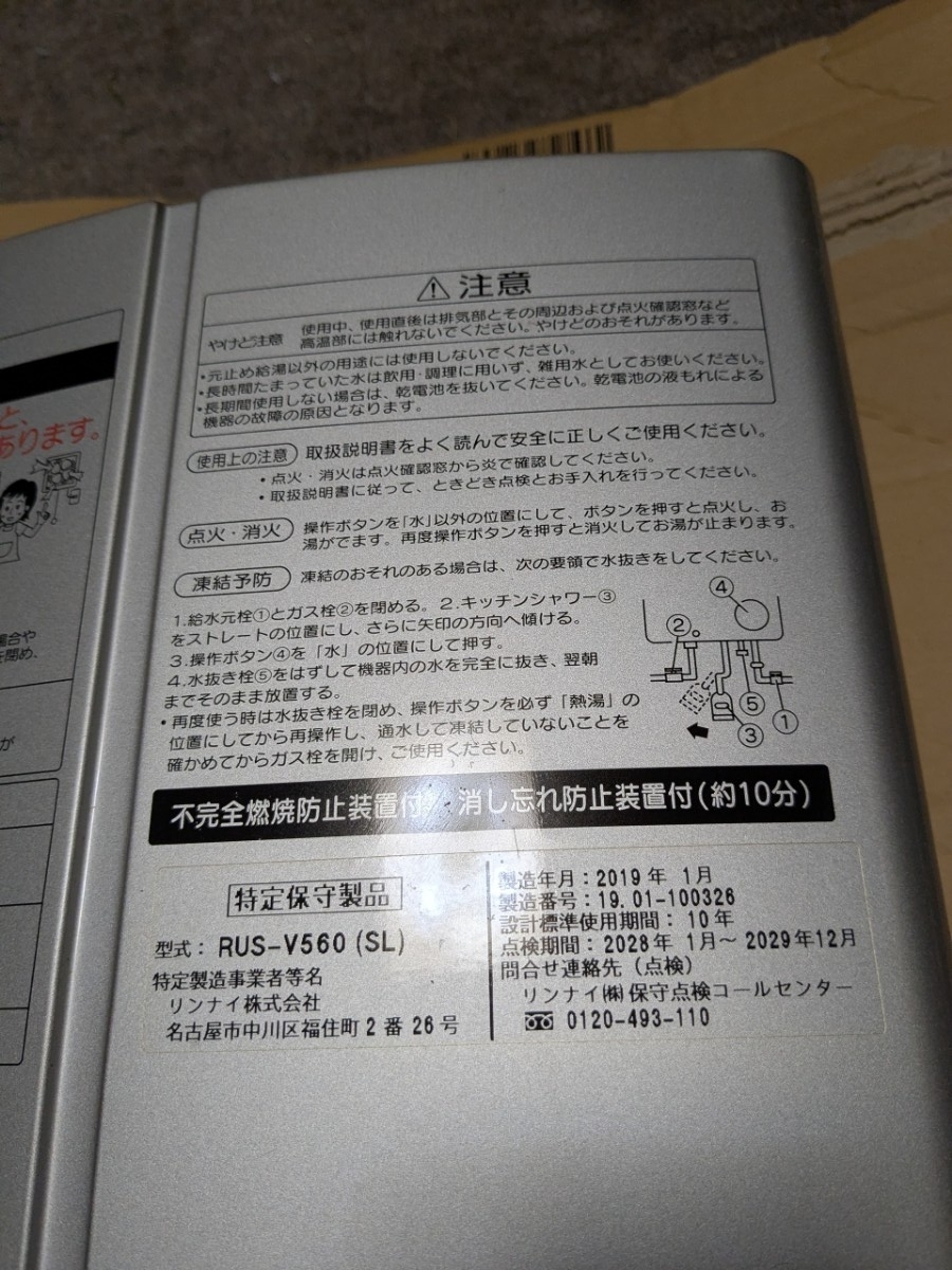 2019年製リンナイ ガス瞬間湯沸器 RUS-V560都市ガス用です。使用感があり、タバコによる汚れが目立ちます。取り外すまで問題なく使用していました。付属品はシャワーのみとなります。よろしくお願いいたします。