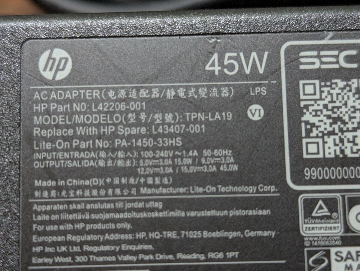 HP 純正45w Adapter TPN-LA19 / USBタイプCコネクタ-