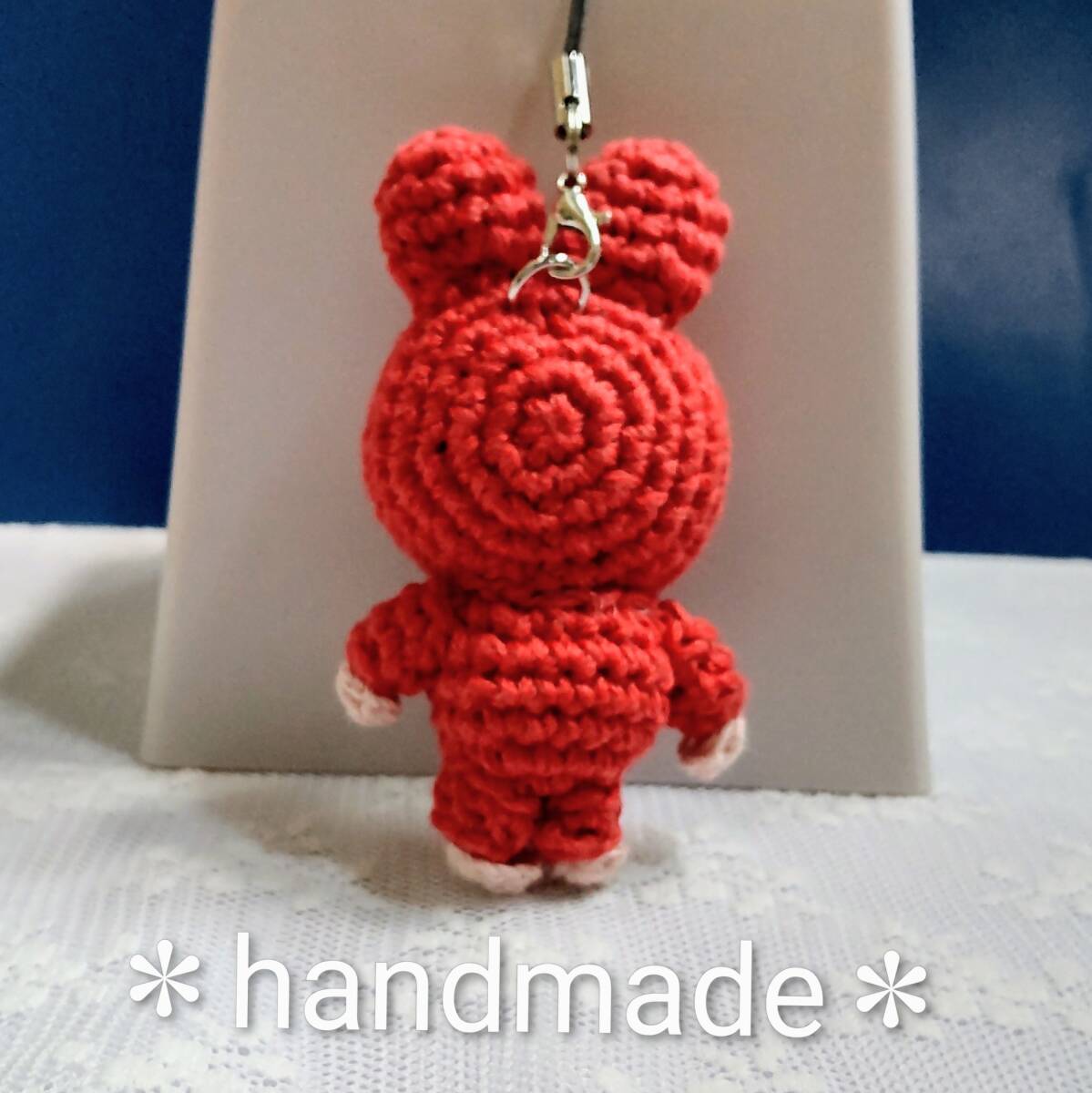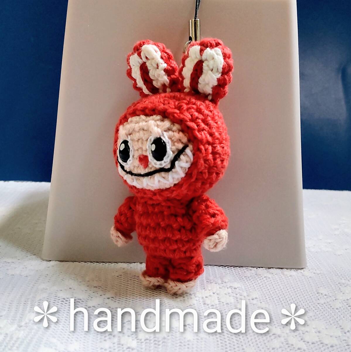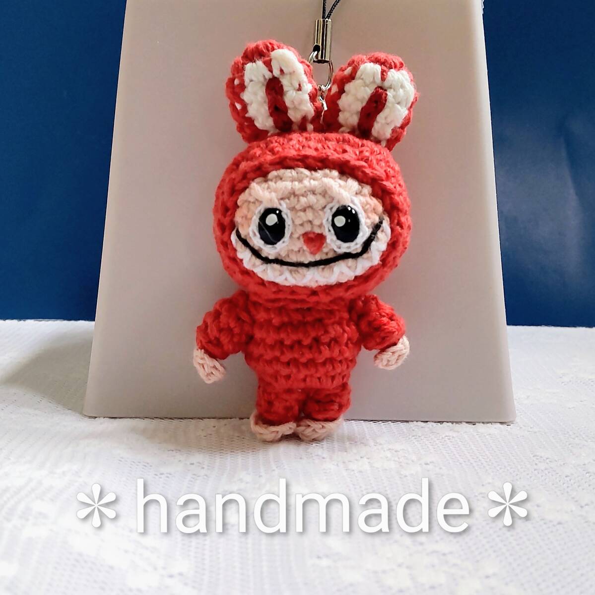 ハンドメイドあみぐるみ★ストラップ★ラブブ風:朱色