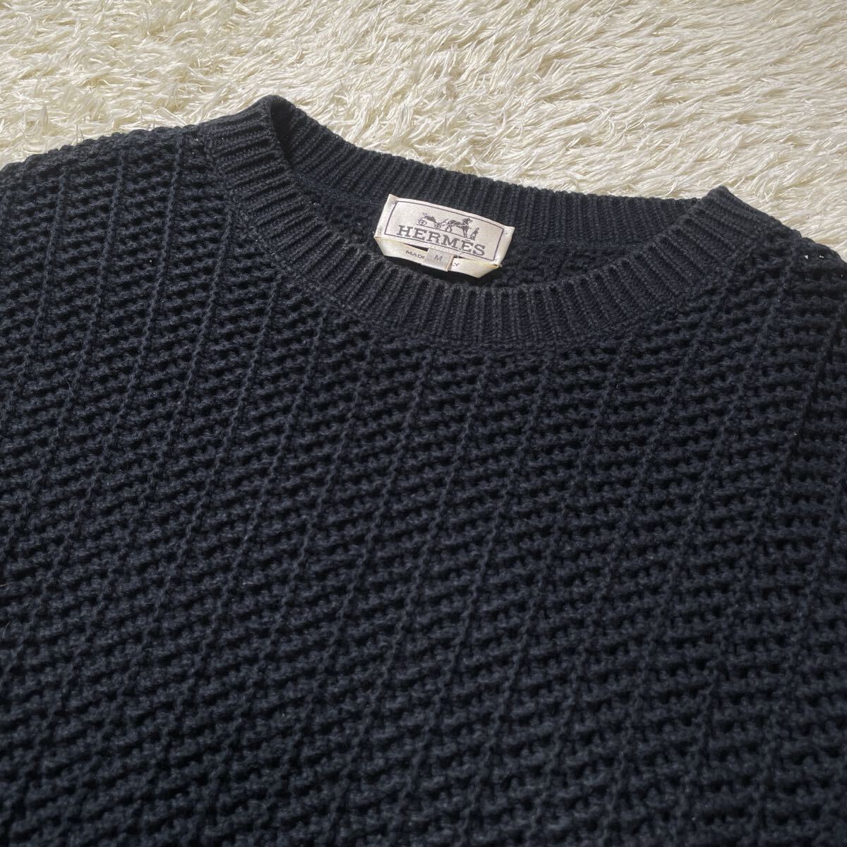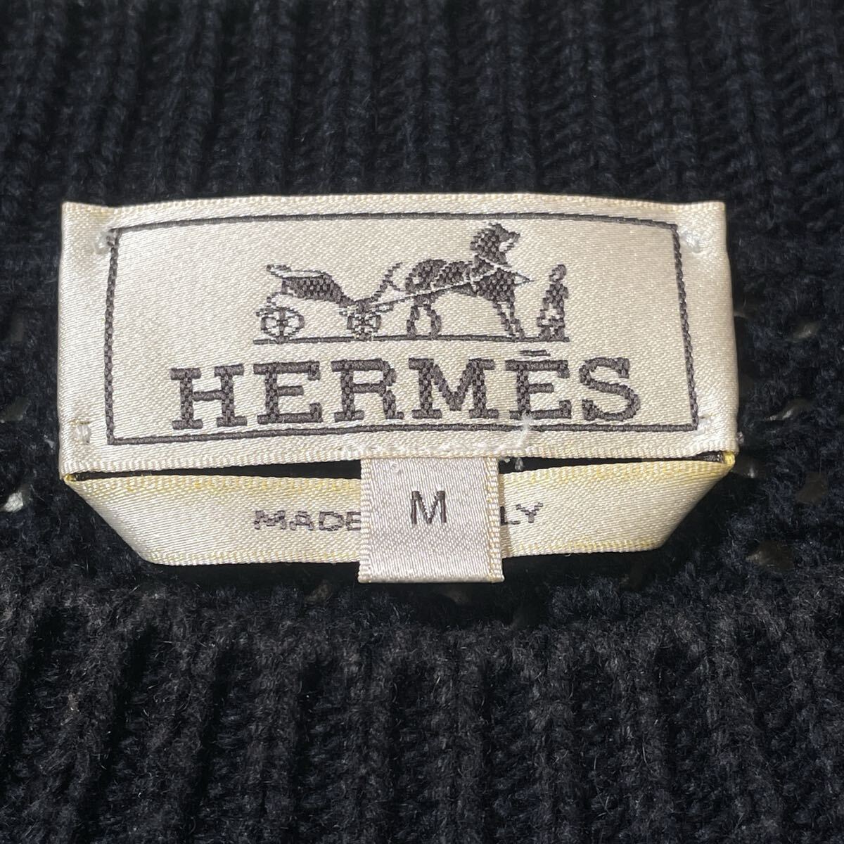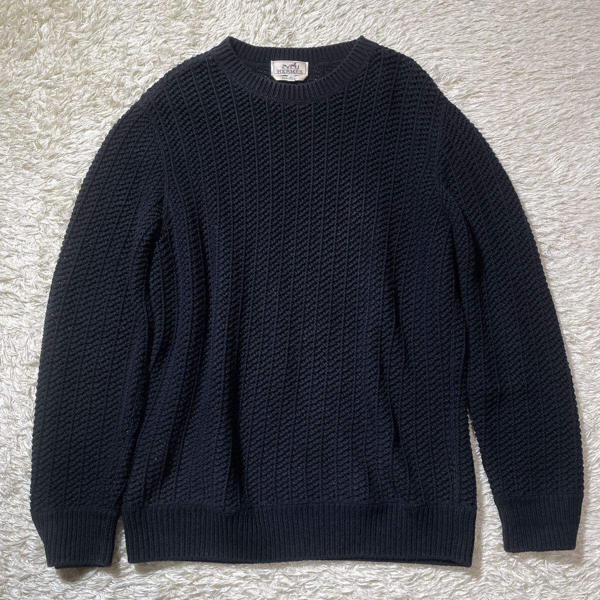 美品 HERMES エルメス 2023年モデル カシミヤ コットン 編み込み ローゲージ ニット セーター トップス 近年品 メンズ サイズM ブラック