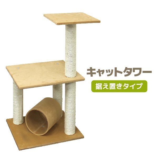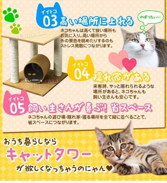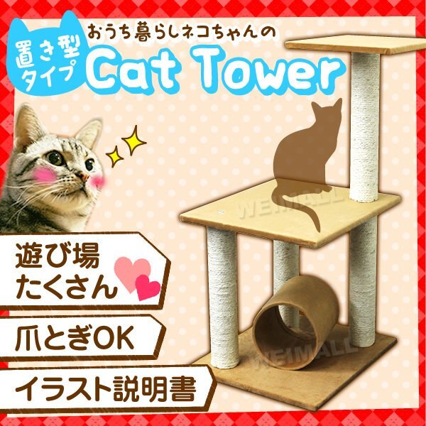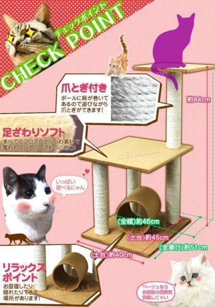 | 支柱は爪とぎできるタイプでネコちゃんのストレス解消に。トンネル付きでゆっくりとくつろぐこともできる! 天井突っ張りタイプが設置できないお部屋にもお薦めです♪ |