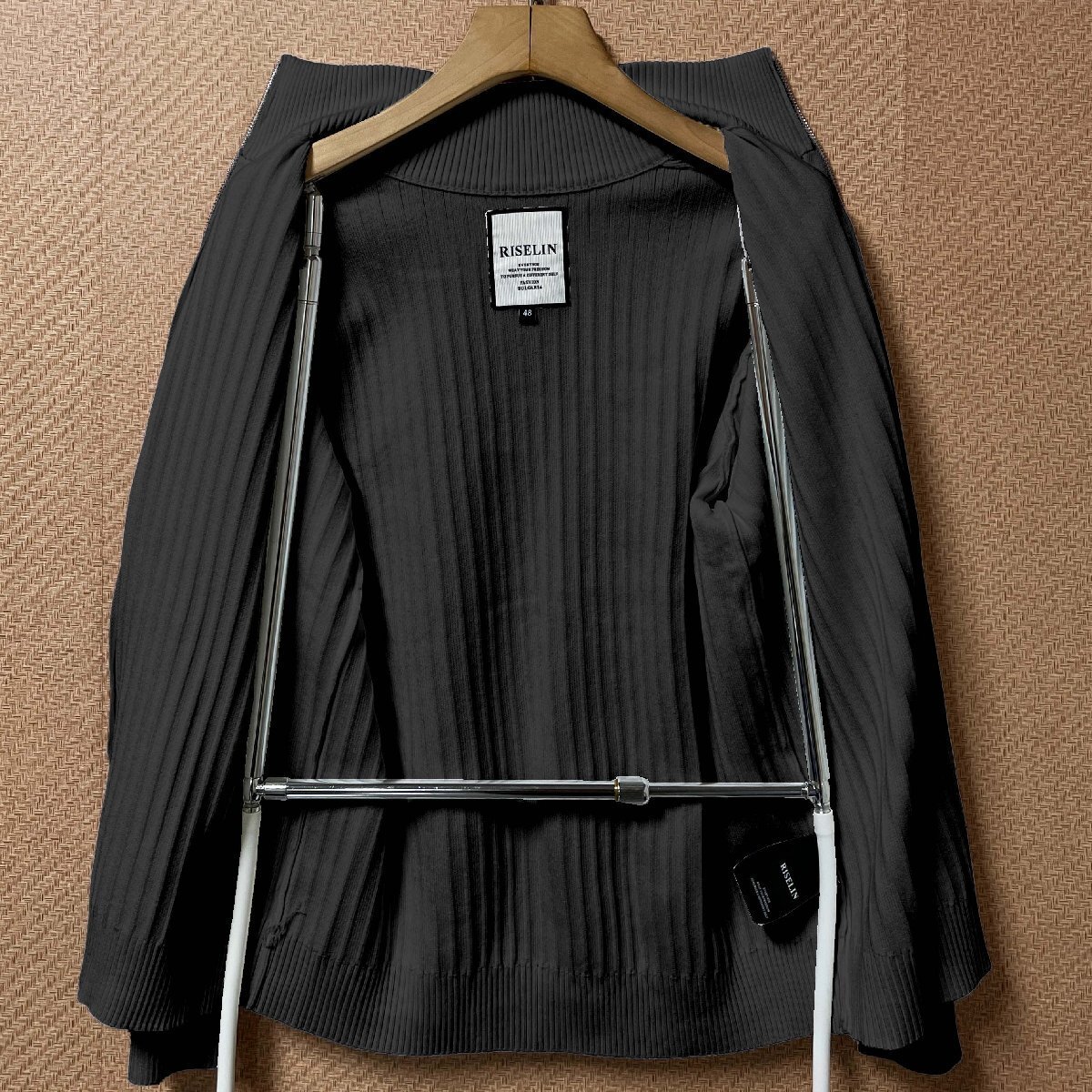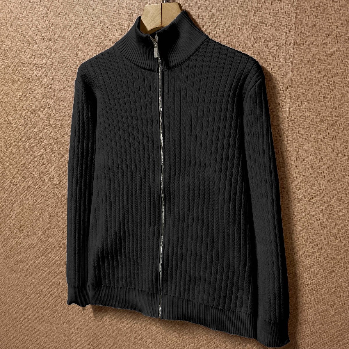 立ち襟はすっきりとした印象を与え、ジップのディテールがコーディネートの幅を広げます。ゆったりめのシルエットで着心地も快適。縦縞のニット編みがシンプルながらも質感をプラスし、精緻な編み目が高品質感を引き立てます。