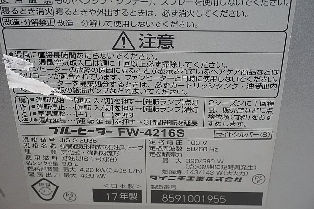 ●◎ DAINICHI ダイニチ 石油ファンヒーター 5.0Lタンク付(青キャップ) 100V 2017年製 ※動作確認済み FW-4216S 【同梱不可】●