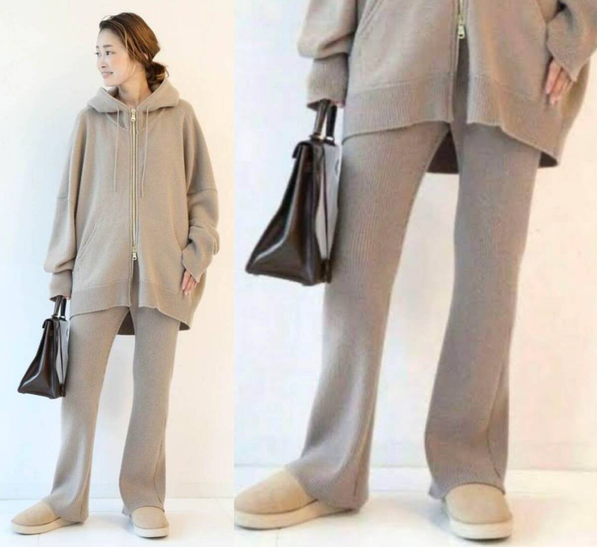 いつものニットパンツより少し細身にし裾を広げることで、スタイルアップ効果も◎(公式サイトより)