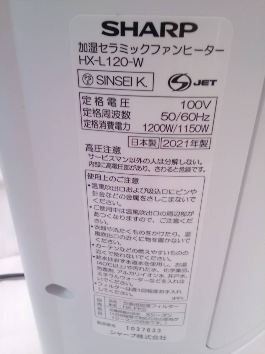 シャープ・加湿セラミックファンヒーター・HX-L120-W・動作確認済・ プラズマクラスター・ 2021年製・【加湿能力】乾燥時期の風邪予防?
