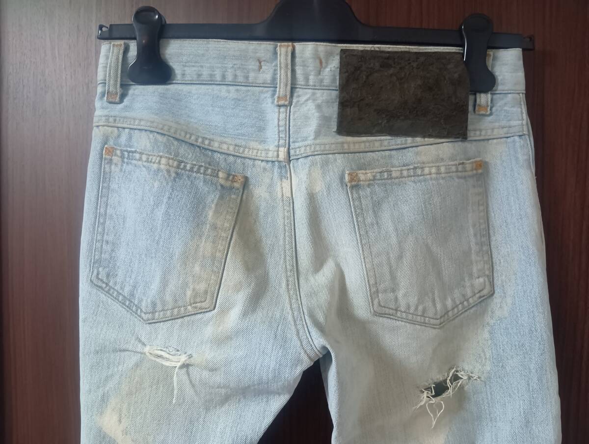 2000年代初頭、ベッカム、中田英寿、木村拓哉などが着用し話題となったモデルで、当時のY2Kスタイルを象徴する一本。大胆なペンキ加工とクラッシュデザインが施され、今ではアーカイブとして再評価されつつあります。