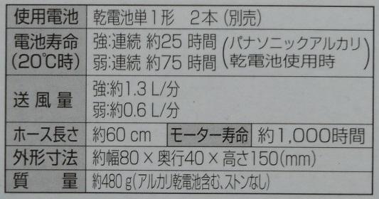 送風量:約1.3L/分(強)・約0.6L/分(弱)