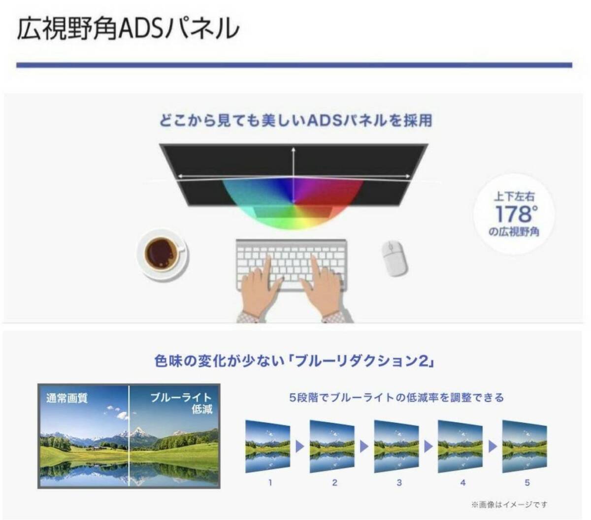 ・上下左右178°の広視野角なADS(Advanced super Dimension Switch)パネルを採用、見る位置や角度による色やコントラストの変化が少なく、どこから見ても映像を鮮明に映し出します。