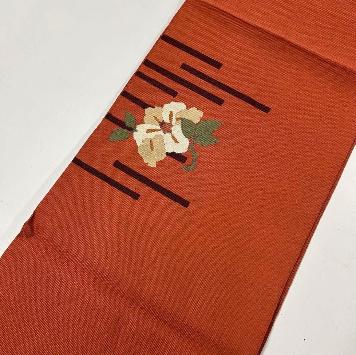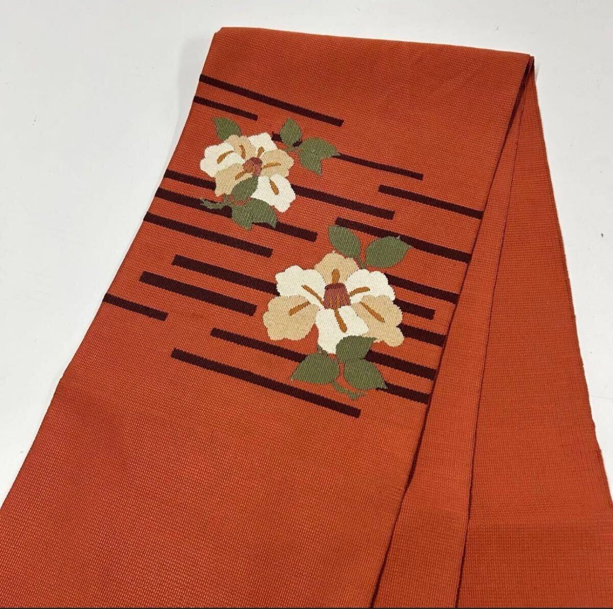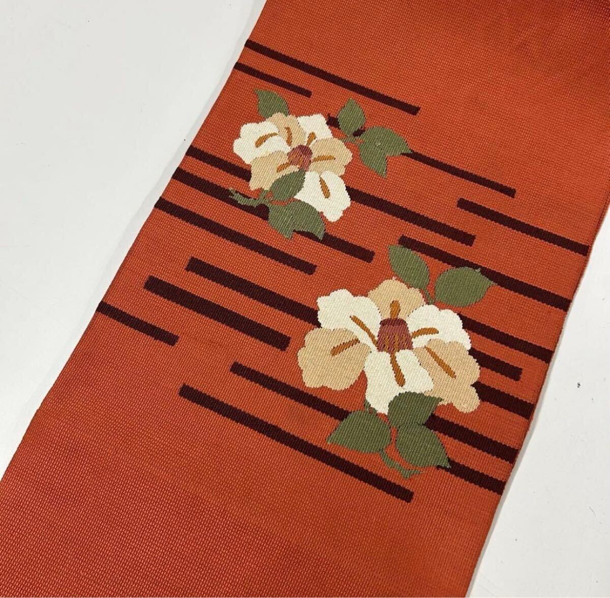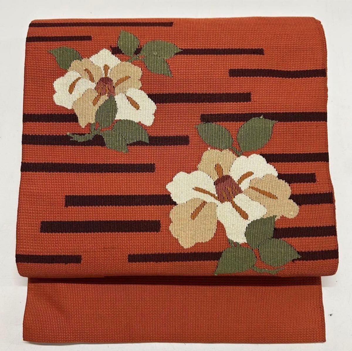 【楓】名古屋帯 正絹 椿にライン シックなデザイン KU-406