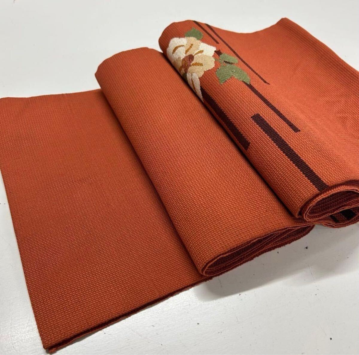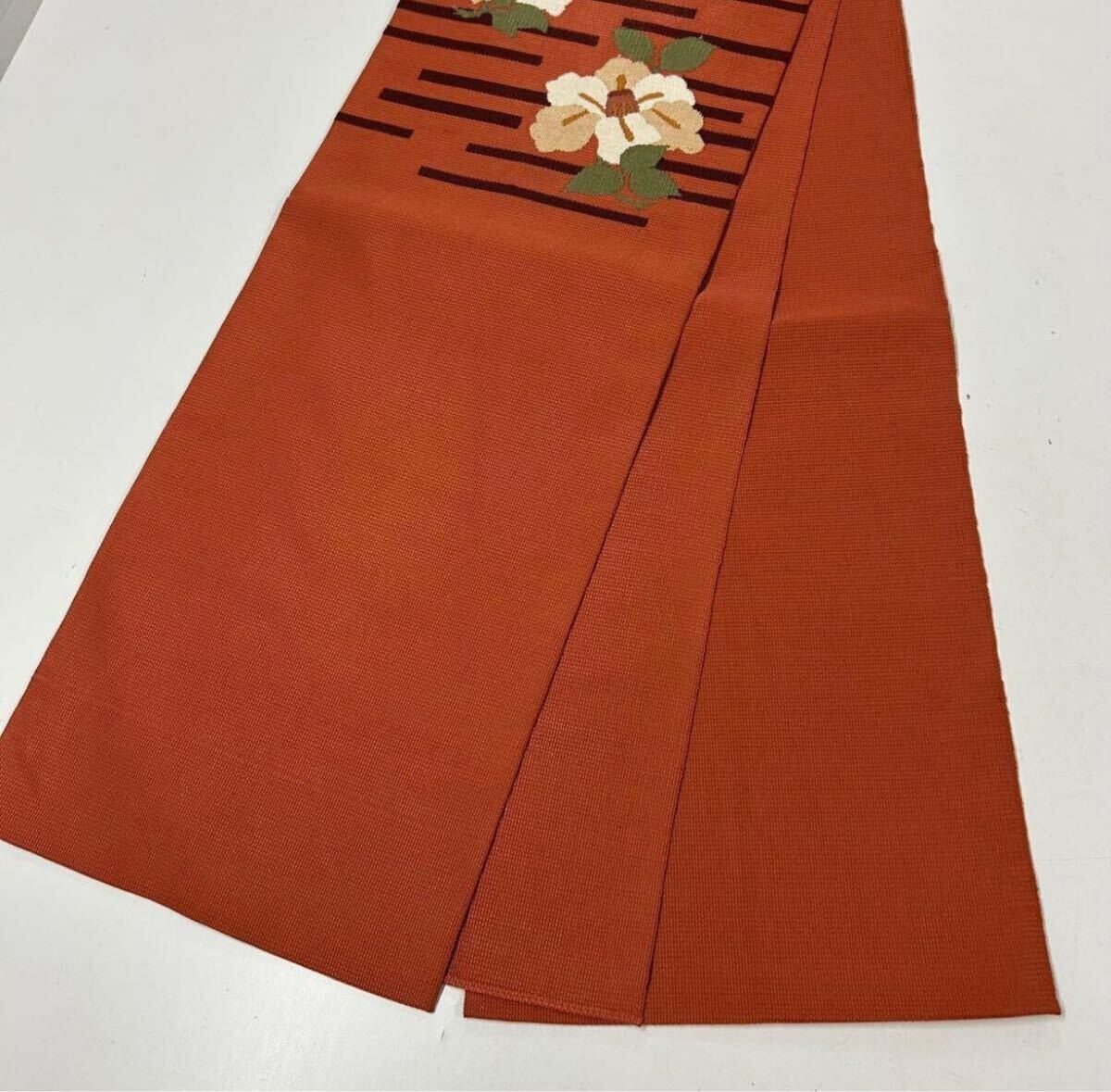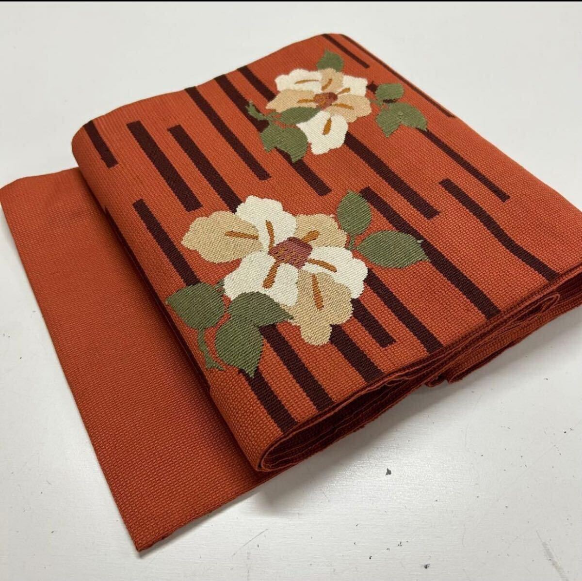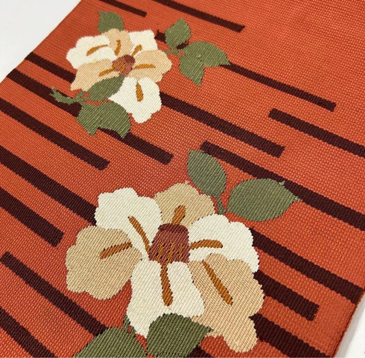 【楓】名古屋帯 正絹 椿にライン シックなデザイン KU-406