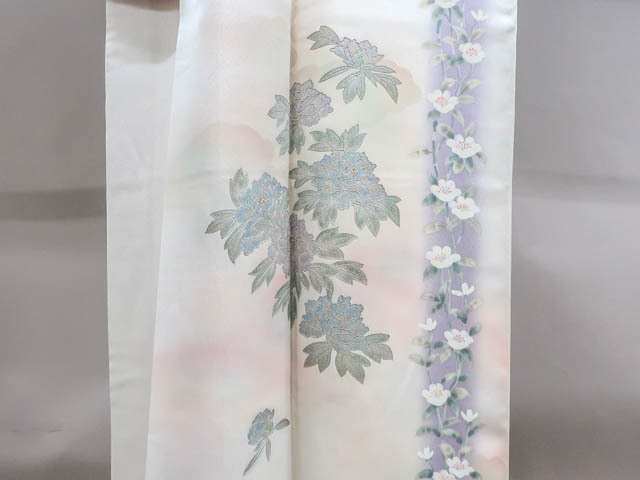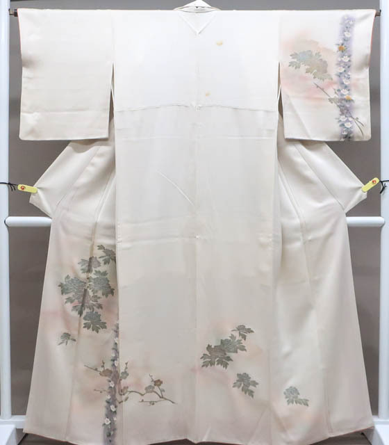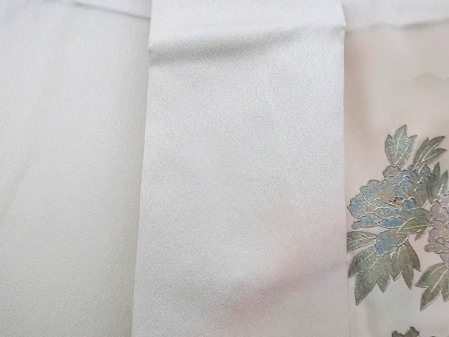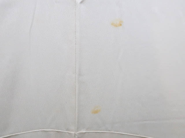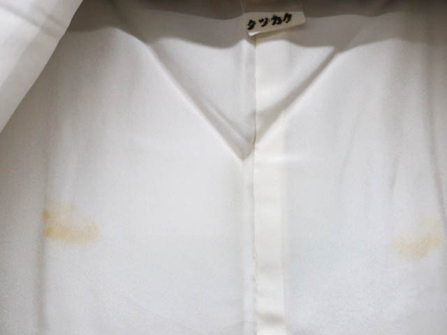 リサイクル商品のため、胴裏・背・衿袖など全体の所々シミがございますがご着用いただけると存じます。 地色はピンクみのある生成りです。 1枚目の画像が近いお色かと思われます。 素材は正絹です。 |