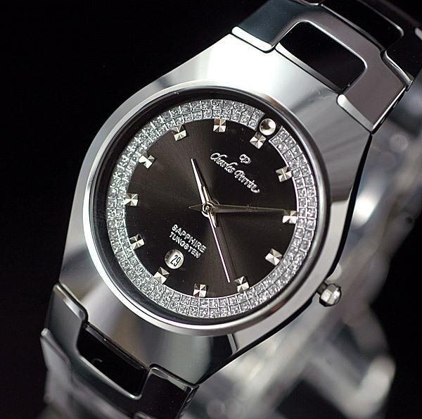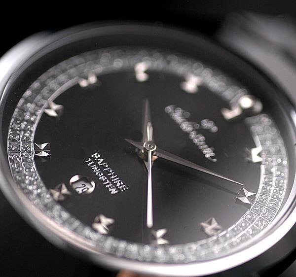 今回の品は、ケースにタングステン、ベルトのカラー部分にセラミックを採用し、文字盤にCZダイヤを散りばめた豪華なスタイリッシュウォッチ。