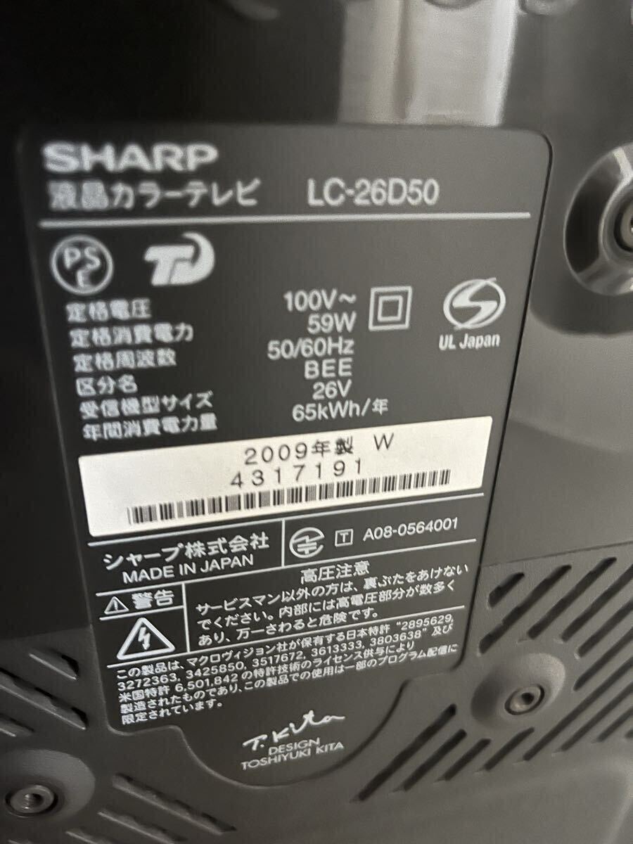 デジタルハイビジョン対応のSHARP AQUOS液晶テレビ ケーブル付