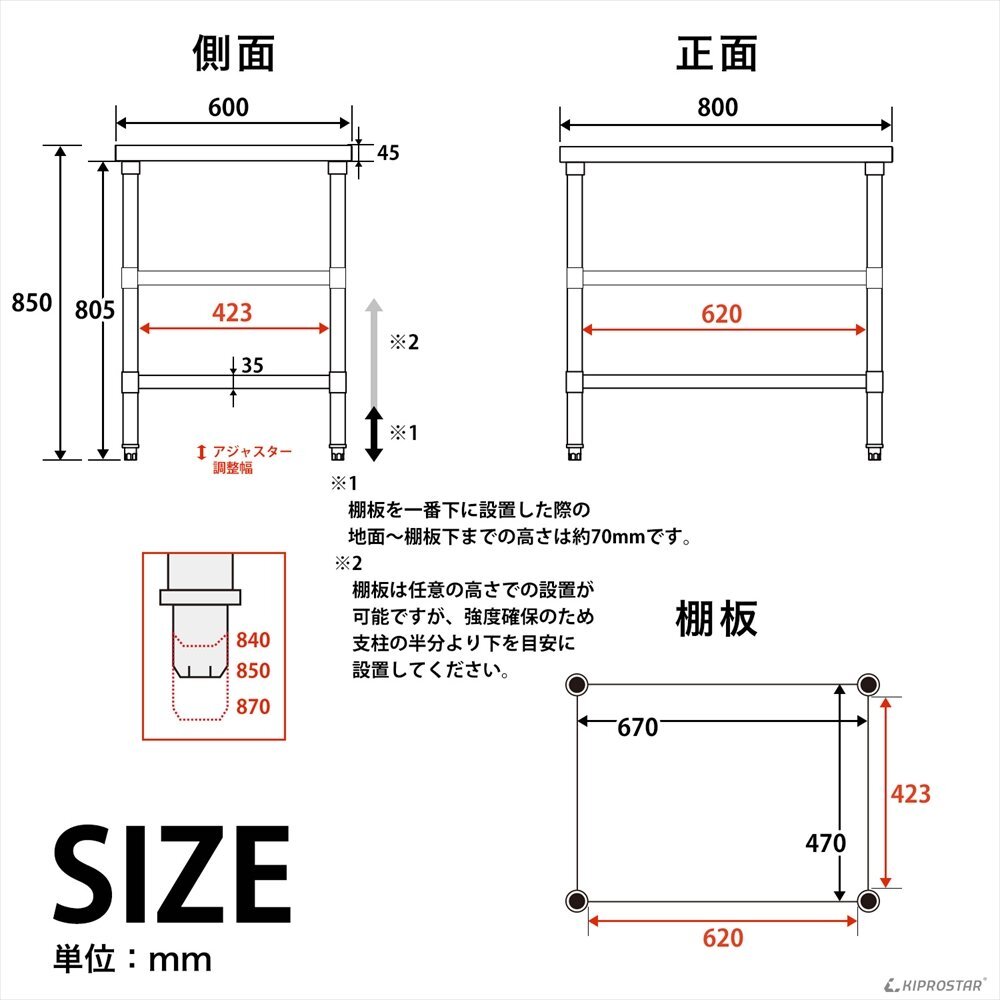 | 材質 | 天板:ステンレスSUS430 脚:ステンレスSUS201 梁:スチール アジャスト脚:ステンレスSUS201/PVC |