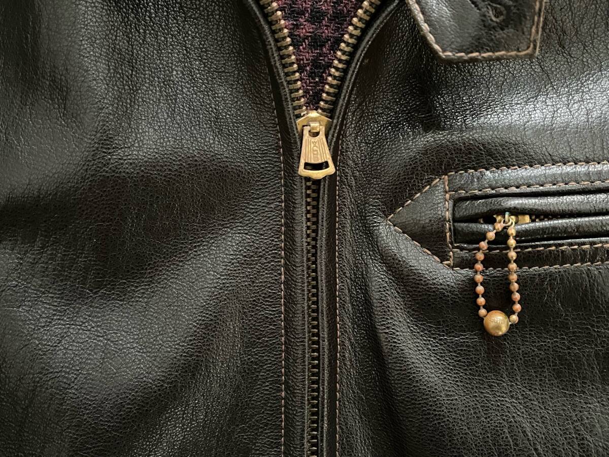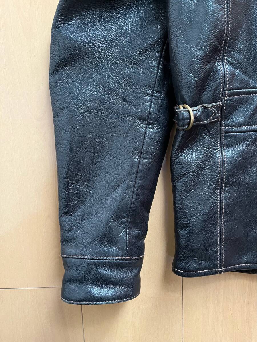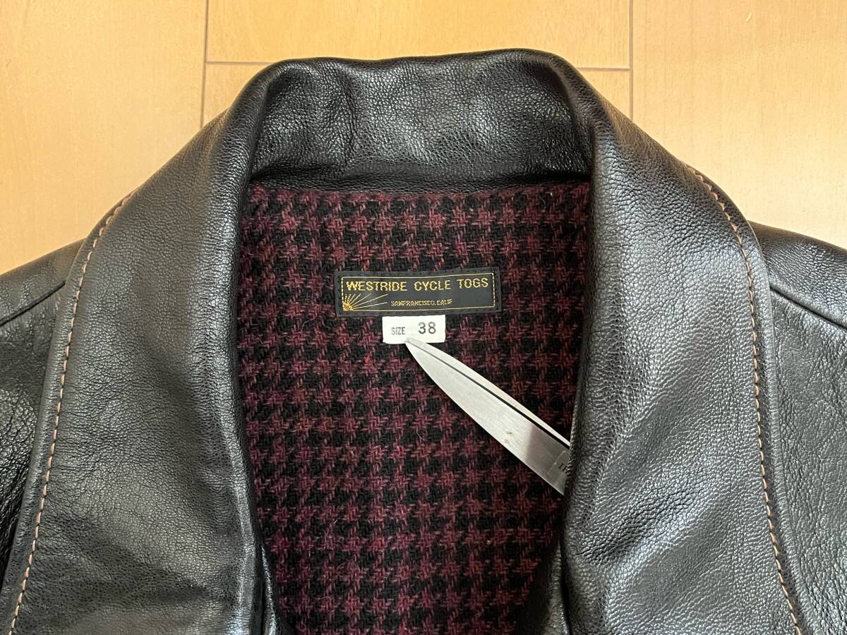 WESTRIDE CYCLE TOGS 40s STYLE  LEATHER  JACKETです。TOP  NOTCH  SPORTS  JACKET  2、サイズ38、カラー DARK  BROWN  こげ茶 、サイズは計測で、身幅55、肩幅47、着丈65、裾幅50、袖丈62、測り方により多少の差はでると思いますので、参考程度でお願いします。山羊革、フルベジタブルタンニンです。レザーのユーズドですので擦れ等はあると思いますが、裏地も含めて状態は良いと思います、画像で確認お願いします。神経質な方、完璧を求める方のオークションへの参加はご遠慮お願いします。ノークレーム、ノーリターンでお願いします。