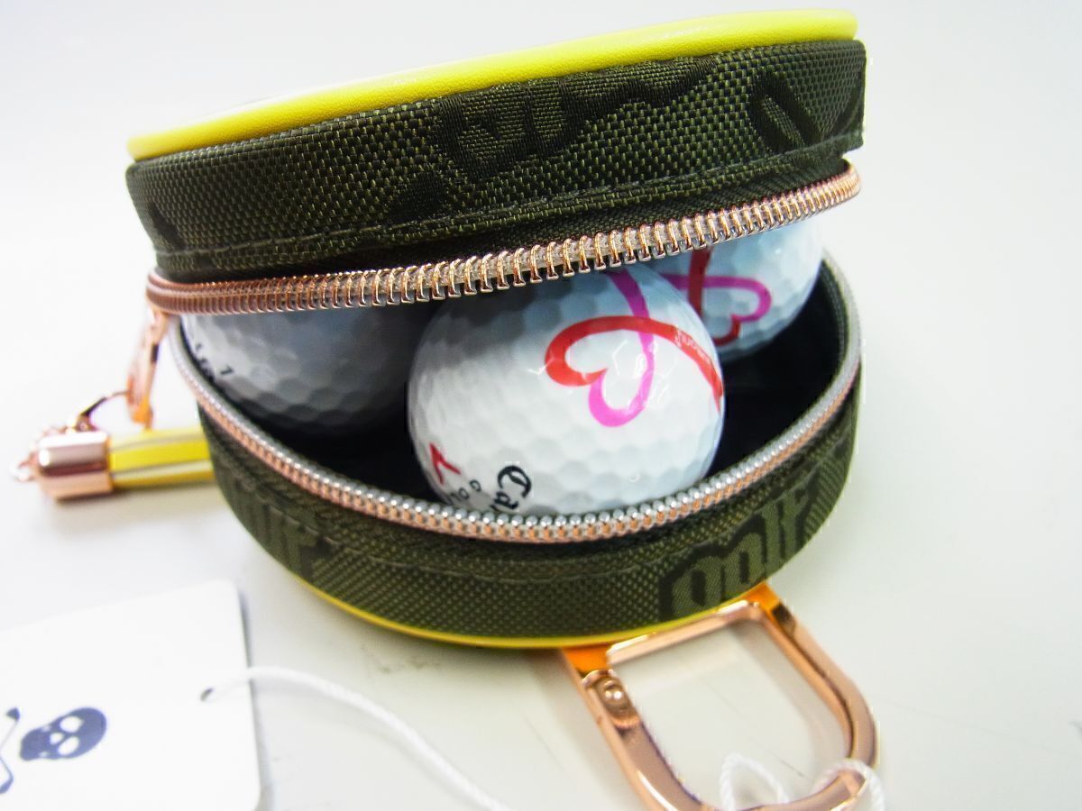 [特徴] ゴルフボールがちょうど3個入る大きさで、ティー入れとしても使用できるサイズ感。トップにはオリジナルのD型カラビナを装着しており、ベルトループに掛けて使用したり、ベルトに通して固定したりと、それぞれのシーンに合わせてお使いいただけます。