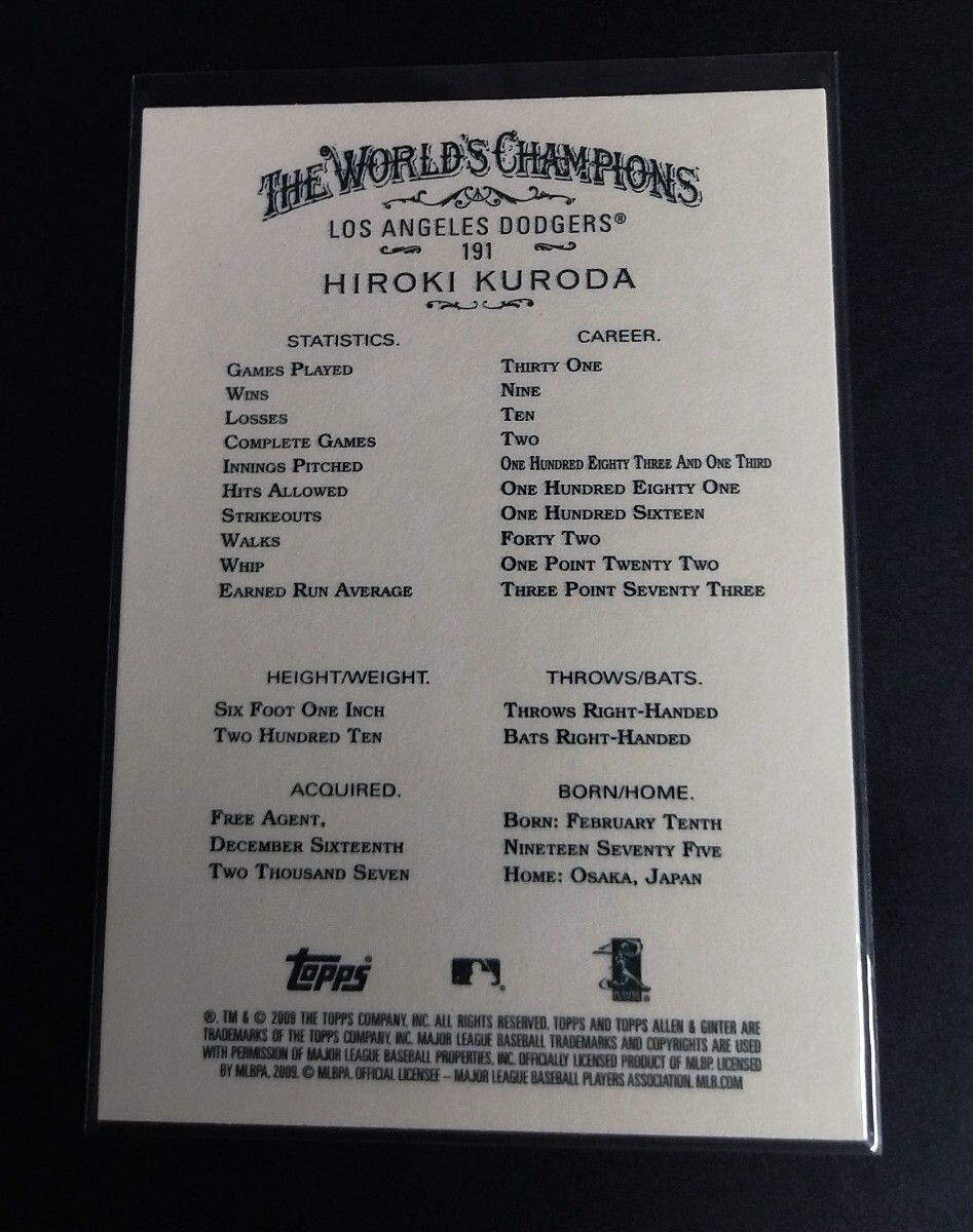MLB 2009年topps ALLEN & GINTER 黒田博樹(ドジャース) No,191。Dodgers HIROKI KURODA