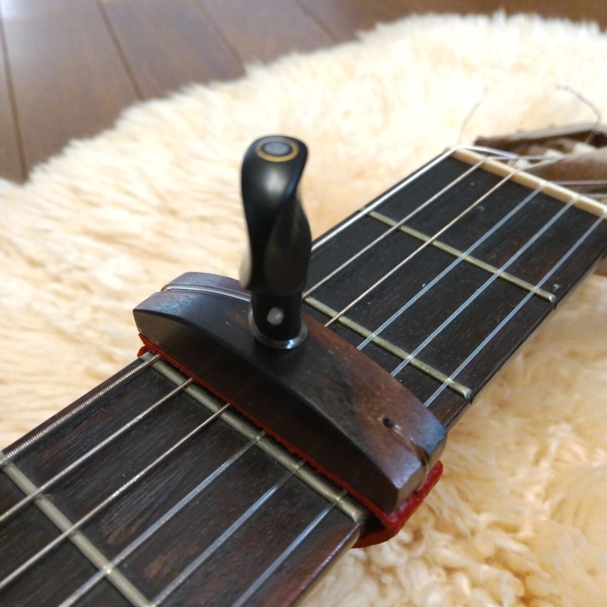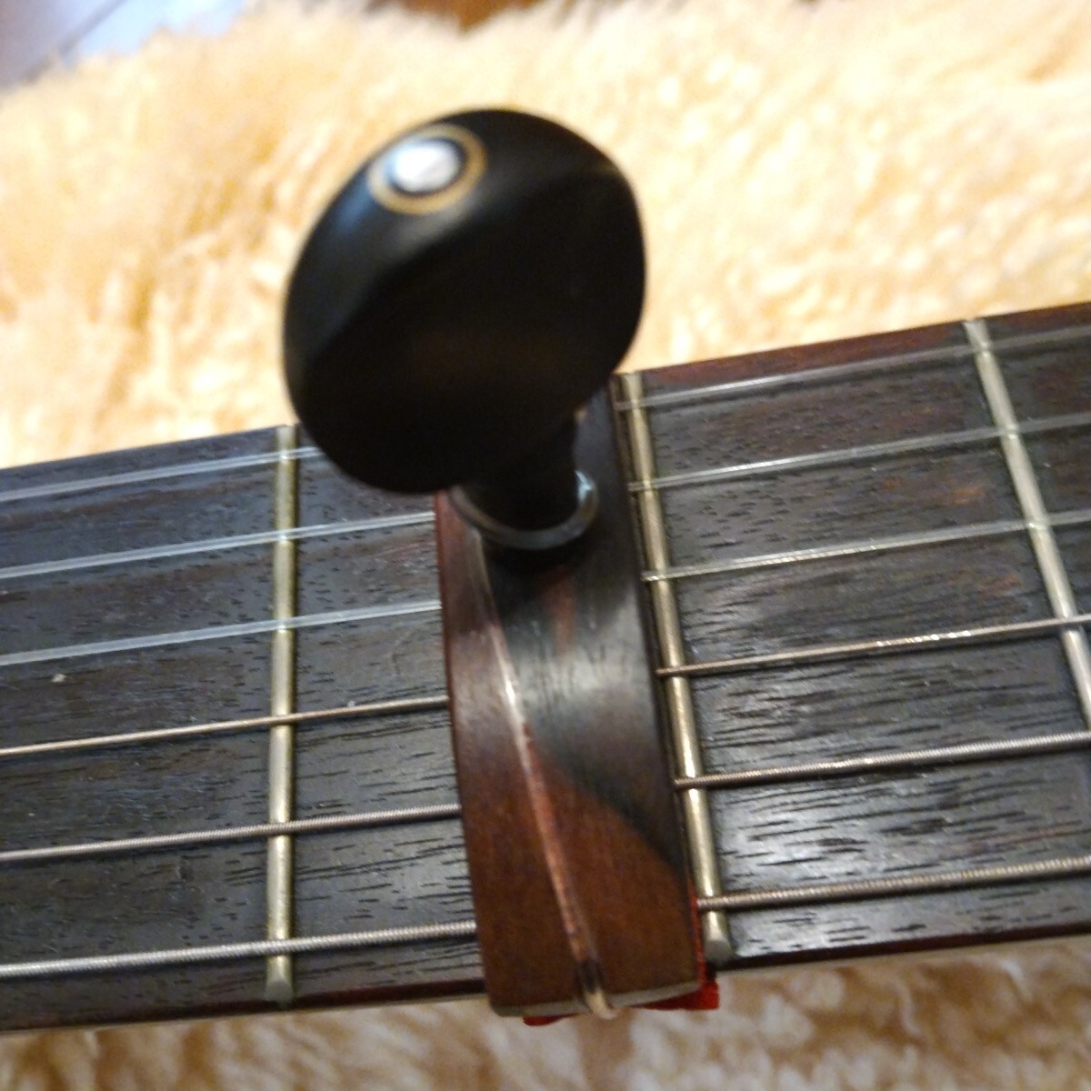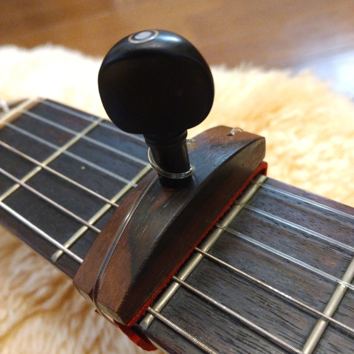 装着時にただペグを 締め上げるのではなく できるだけ フレットに 近づけ 左手で 指板にカポを ぎゅっと 押し付けておいて その状態で ペグを巻いて 締め る のがコツです。