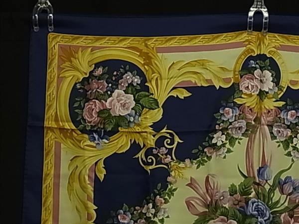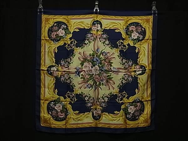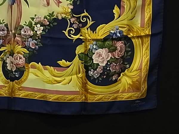■美品■ LONGCHAMP ロンシャン シルク フラワー 花柄 大判 スカーフ ストール ショール レディース ネイビー系×マルチカラー DH1092