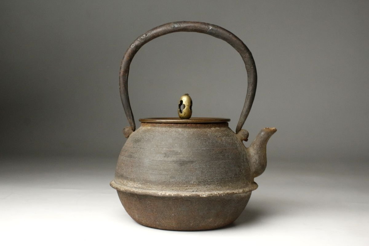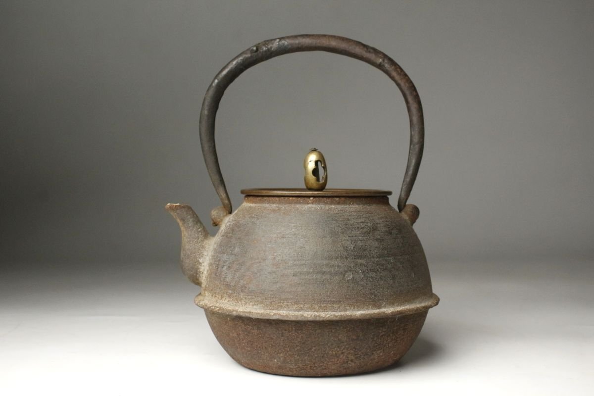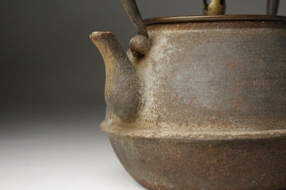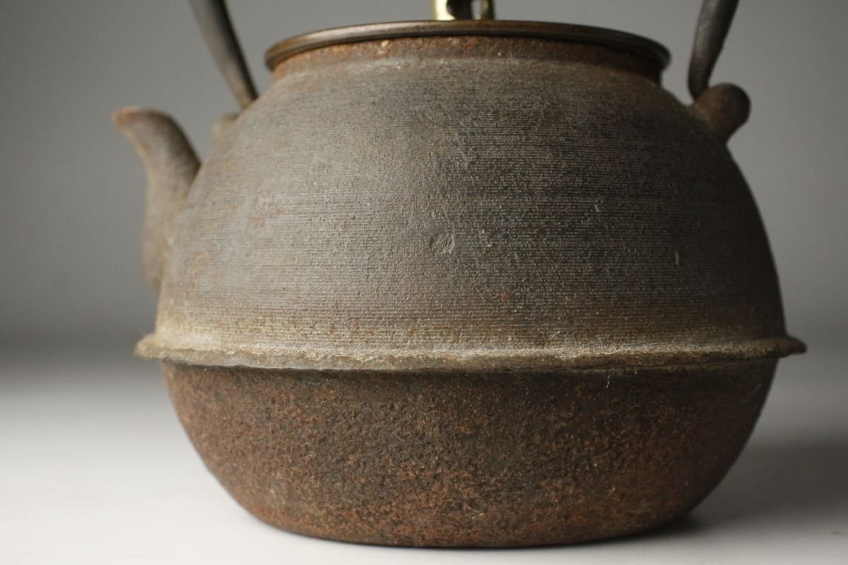 * * * 商品詳細 * * * ここでしか出逢うことのできない唯一の美をご紹介させて頂きます。 古鉄地は味わい深く、経年を経てきたものならではの風格を感じさせる鉄瓶のご紹介です。 整った隙の無い造形で摘みの繊細な造形等、端々に高い美意識が感じられます。 装飾などはありませんがそれぞれの質感がより良く感じられ、深い魅力があります。 現代まで大切に受け継がれてきたことが伺える、時代感じる逸品です。 ■サイズ/横15㎝×高18㎝×奥行14㎝ 箱:横15㎝×高21㎝×奥行15㎝ ■状態/スレ、キズ、サビ、底に穴、内に剥げ、 箱に腐食、割れ、欠け、キズがあり脆くなっています。 ※写真にてご確認、ご了承の上ご入札下さい。