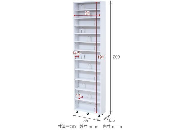 幅16.5cmの隙間を埋めてスッキリ収納。 たくさん増えて置き場に悩む、本やメディア類もこれ一台にまとめることができます。 棚板は11枚付いているので、12段の棚を作ることができ、収納の自由度が高い隙間ラックです。 |