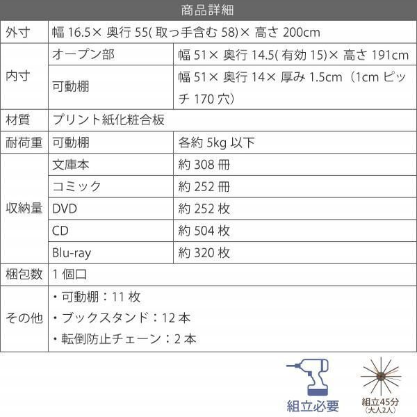 【カラー】 ダークブラウン、ナチュラル、ホワイト 【サイズ】 <外寸> 幅16.5×奥行55(取っ手含む58)×高さ200cm <内寸> オープン部:幅51×奥行14.5(有効15)×高さ191cm 可動棚:幅51×奥行14×厚み1.5cm(1cmピッチ170穴) 【材質】 本体:プリント紙化粧合板 【耐荷重】 可動棚:5kg以下 【収納量】 文庫本:(約)308冊 コミック:(約)252冊 DVD:(約)252枚 CD:(約)504枚 Blu-ray:約(約)20枚 【生産国】 ベトナム 【梱包】 サイズ:120.5×23×24.5cm、重量:24.5kg 【その他】 ・可動棚:11枚 ・ブックスタンド:12本 ・転倒防止チェーン:2本 【組み立て品】 お客様による組み立てが必要です。 【ご注意】 ・サイズ、重量は概算です。 ・商品カラーはご使用のモニターによって実際の明るさや色と異なって見える場合がございます。 |