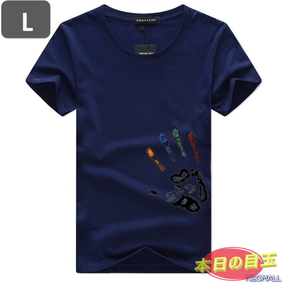 本日のお買得 ☆ 丸首 半袖 Tシャツ【457】 ネイビー Lサイズ トップス シャツ シンプル イラスト デザイン 春夏