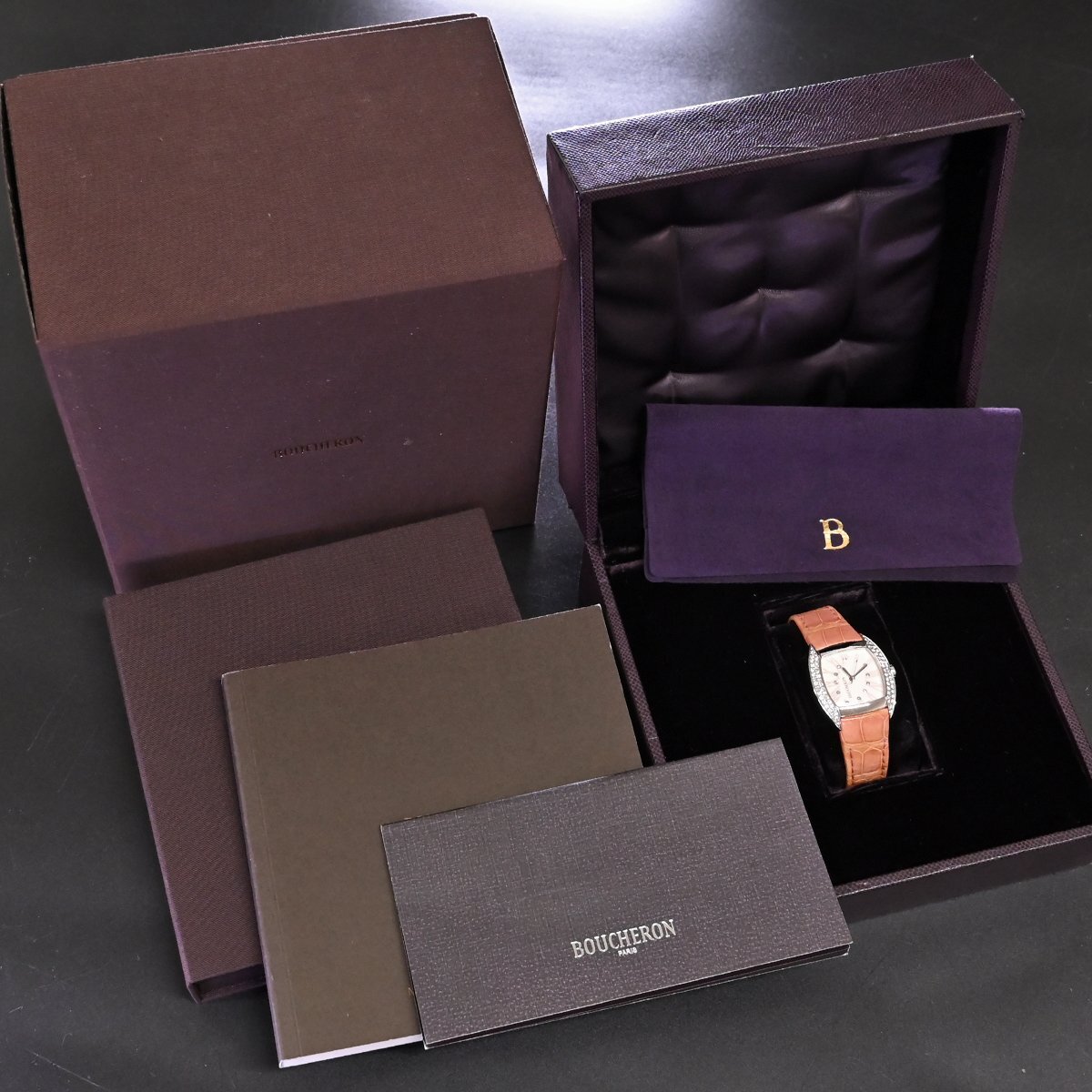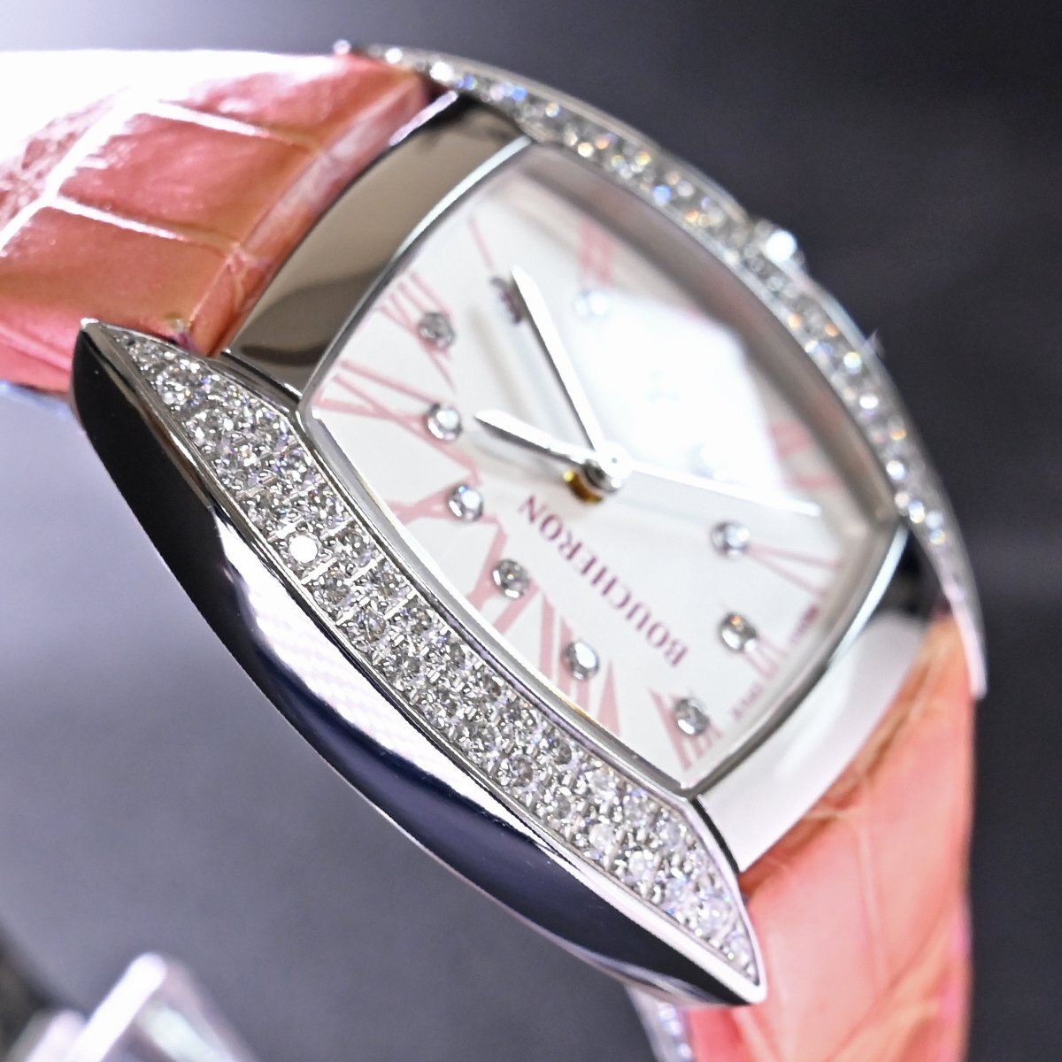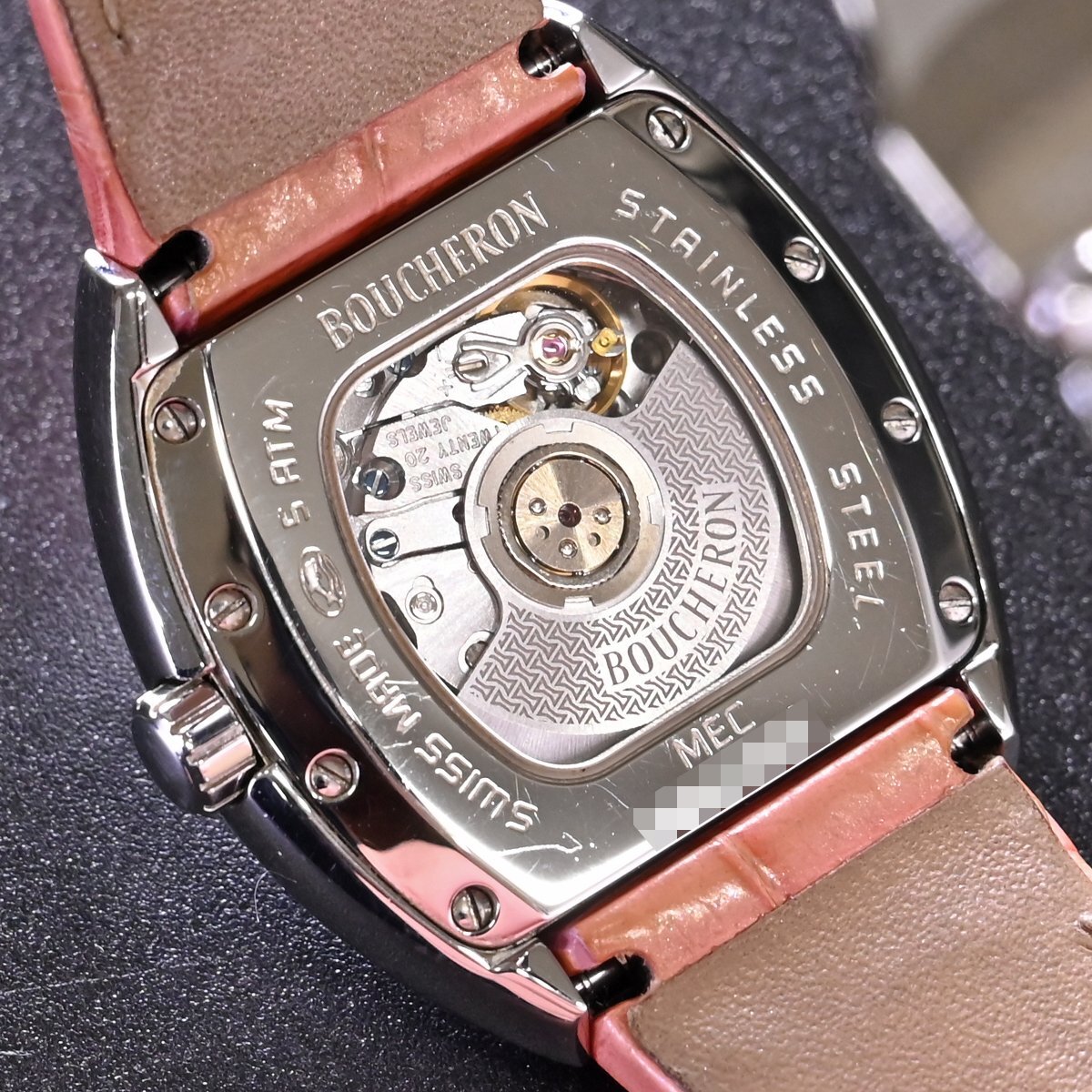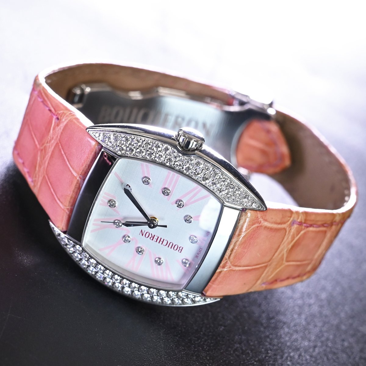 ブシュロンの純正ダイヤ MEC オートマチックです。 フランスを代表する高級宝飾品ブランド、ブシュロンが手がけた「MEC」。 曲線で形成された優雅なトノウカーベックスケースにハイスペックオートマチックムーブメントを搭載した本格的な一本です。 市場流通量の圧倒的に少ないモデルなのでお探しの方も非常に多いかと思います。 ※基本動作確認済。 |