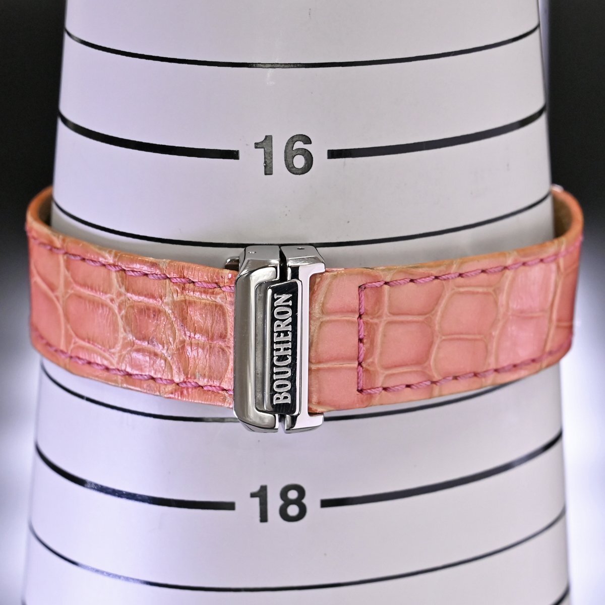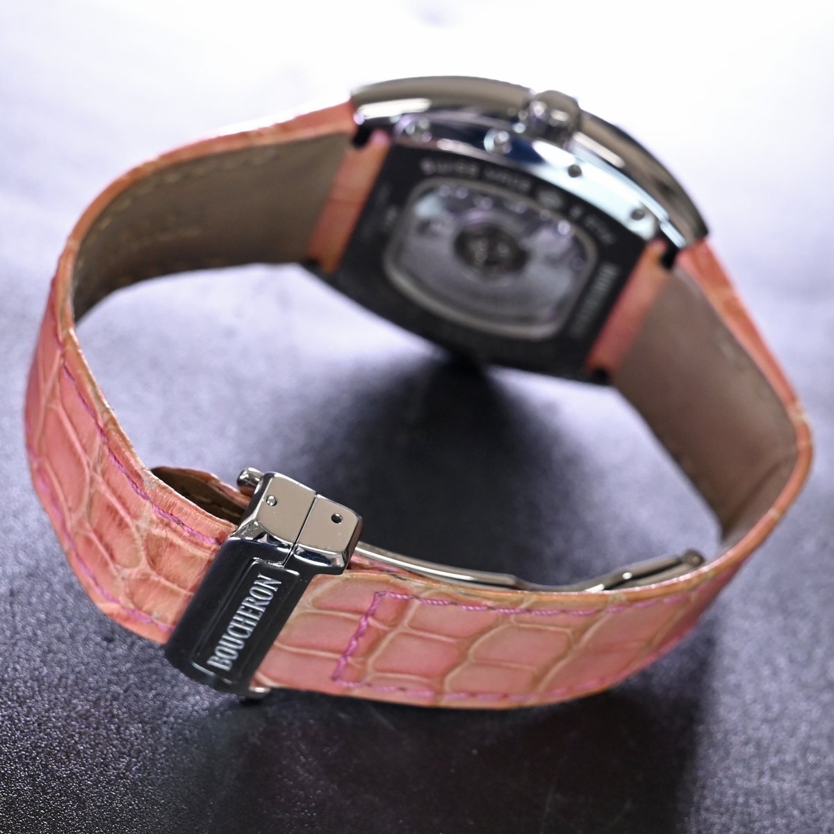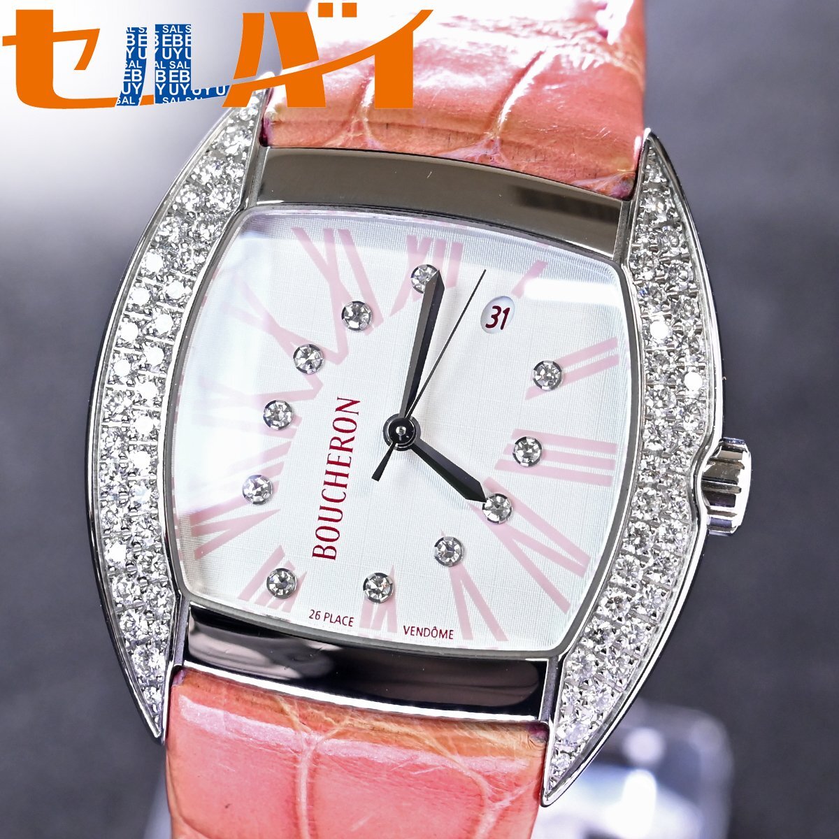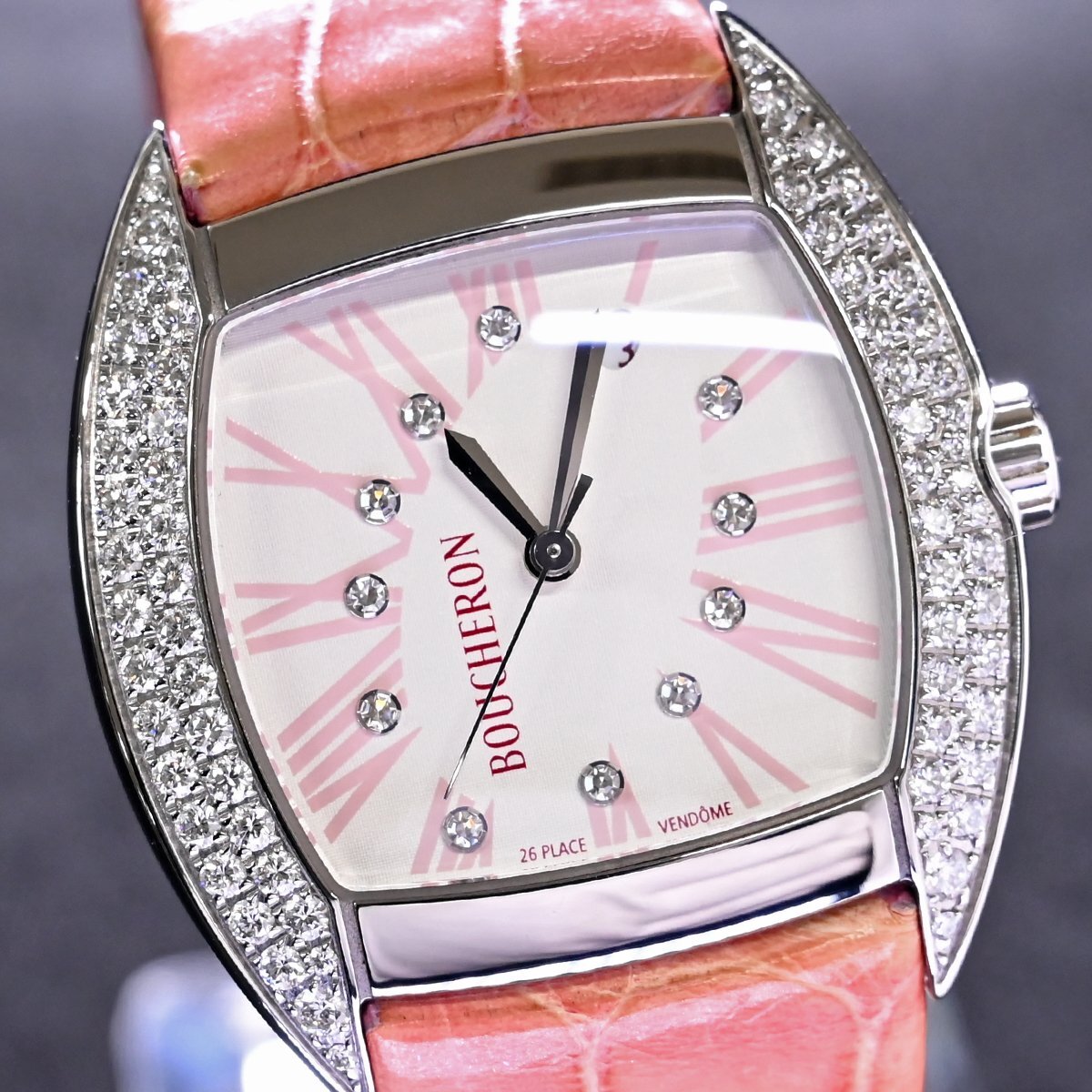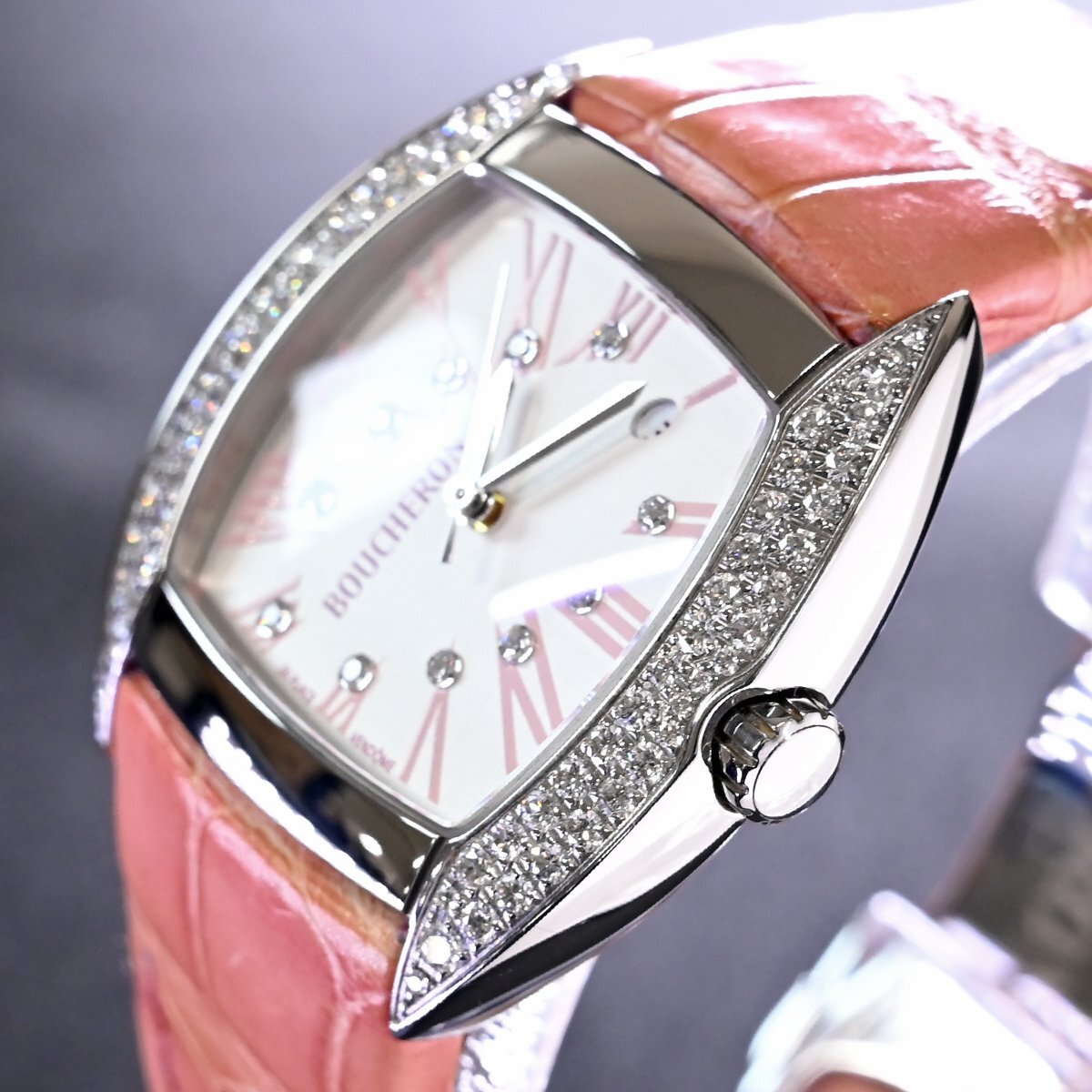 ブシュロンの純正ダイヤ MEC オートマチックです。 フランスを代表する高級宝飾品ブランド、ブシュロンが手がけた「MEC」。 曲線で形成された優雅なトノウカーベックスケースにハイスペックオートマチックムーブメントを搭載した本格的な一本です。 市場流通量の圧倒的に少ないモデルなのでお探しの方も非常に多いかと思います。 ※基本動作確認済。 |
