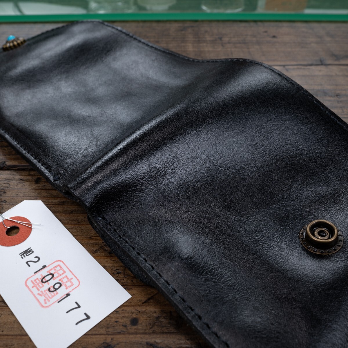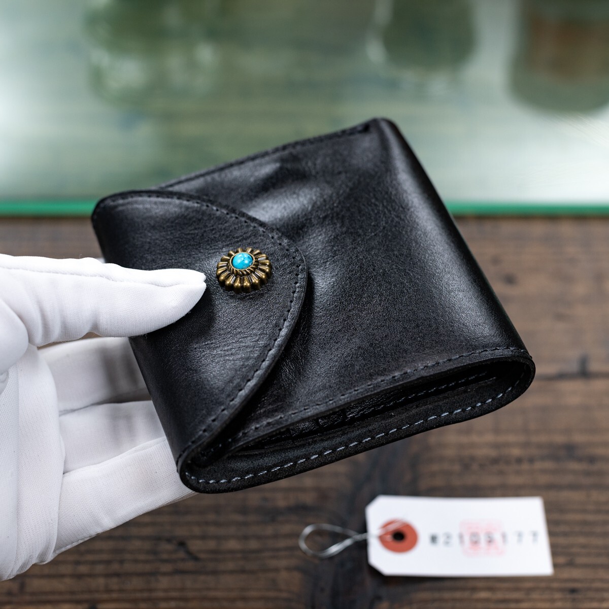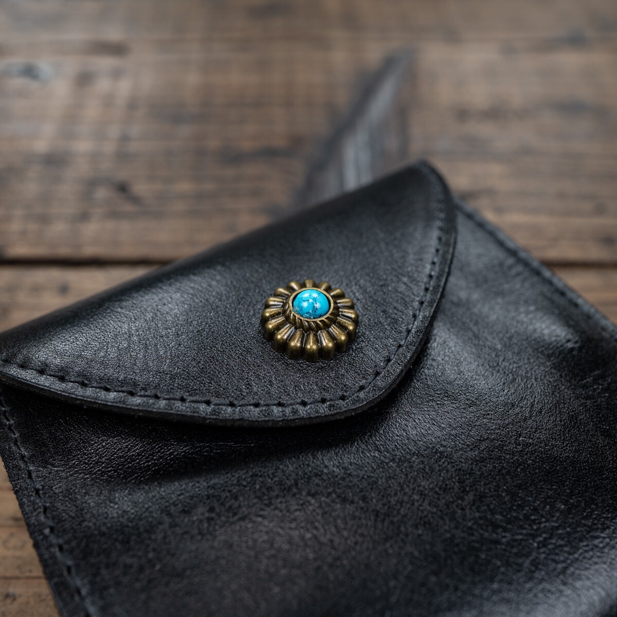 白銅製のコンチョにはターコイズがあしらわれており、さりげないアクセントになっています。特別な手入れは必要なく、レザーとともに経年変化を楽しめます。